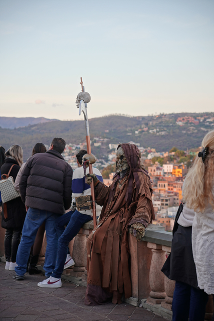 集合後我們又搭纜車登上瞭望台,黃昏時刻遊客明顯更多,還有持著鐮刀的死神亂入。我找了地方坐下,漸漸能體會眼前這景的迷人之處,下午覺其過亂,色彩衝突,此刻在夕陽的溫黃撫觸下,就像罩了濾鏡,驕矜的遞出友善,突兀的被柔化。怔望片刻後,也不禁尋覓稍早的步跡,由近處的劇院與「聖雅各教堂」、劃至中央的「聖母聖殿」。「接吻巷」不太可能辨得出,倒是在視野的最左邊,找到那曾被血腥侵污的斑駁糧倉。