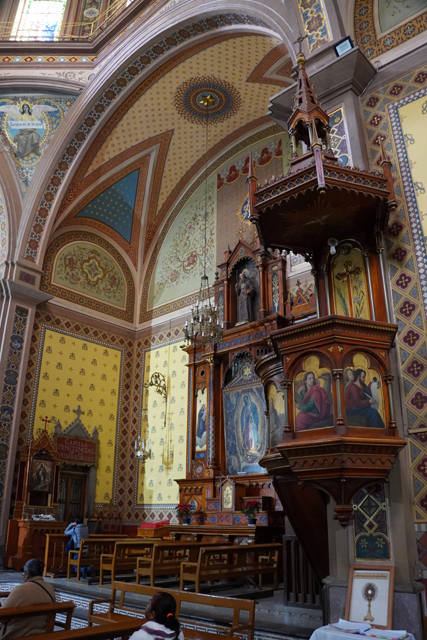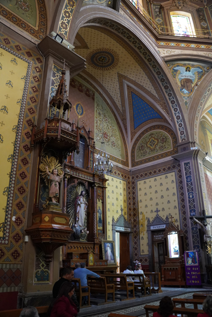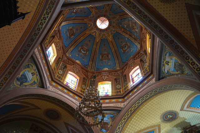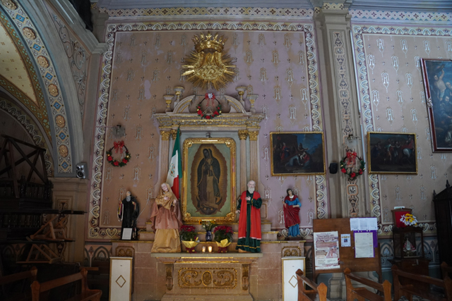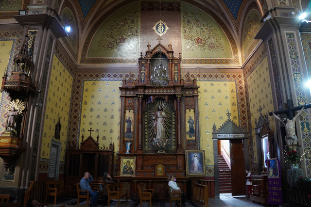 望向左右,兩側壇是同風格的簡化版,奉著「基督聖心」跟「瓜達露佩聖母」。當隨著拍攝,將視線挪往上,主穹頂再次令我驚訝,金色紋帶在中心似花蕾盛放,也如日芒綻射,之間有很細膩的葉藤纏綴,框格裡亦以繁複圖騰堆疊,鑲入天使飛臨。