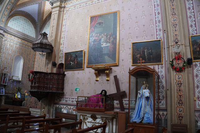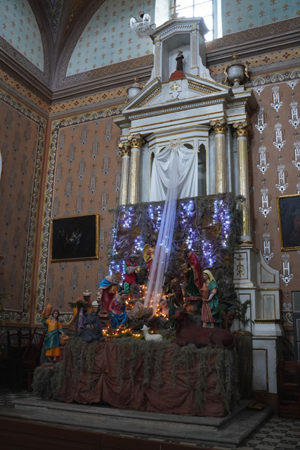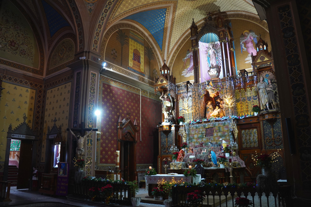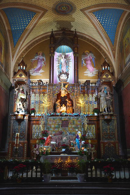 沒想到當走了進去,裏頭竟滿亮眼,肋拱飾帶切出的框格裡,都填入散點徽印的不同色塊。但彩度有刻意壓低,赭紅、米黃、淡綠,僅在天篷嵌以亮藍的跳色。行至主祭壇,在這被巴洛克跟新古典主宰的城市裡,它很稀有地納入哥德元素,龕頂有蕾絲般的勾勒,再以尖塔挑飛,下段的長弧框內則攀滿花卉。而這並非妝點的全部,於聖母的守望下,祭龕將「馬槽降生」實體化,且因著聖誕節又佈置得更加繽紛,三賢者已來朝,並多補了一個耶穌娃娃。