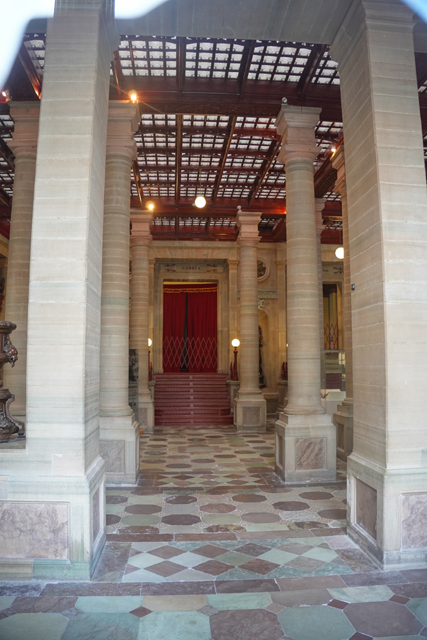 既以此人名之,外觀自不可能敷衍,門廊頂有八位謬思女神各展姿態,飾帶花串間有代表喜劇悲劇的面具。與其鄰居相比,雖僅是新古典的山簷高柱組合,卻不會令人感到無趣,或許這就是設計師功力所在吧。我從踞坐雄獅望至典雅燈列,看它們與門柱、謬思營造的參天氣勢,又上了階台往內窺看。根據網路圖片,表演廳以摩爾人風格打造,有層層不同的拼貼圖騰,如繁花開綻。然要見識此等繽紛,自然得先繳出門票錢和時間,現刻的我僅能瀏覽門窗的花瓣式樣、陽臺的鐵籬挑捲。