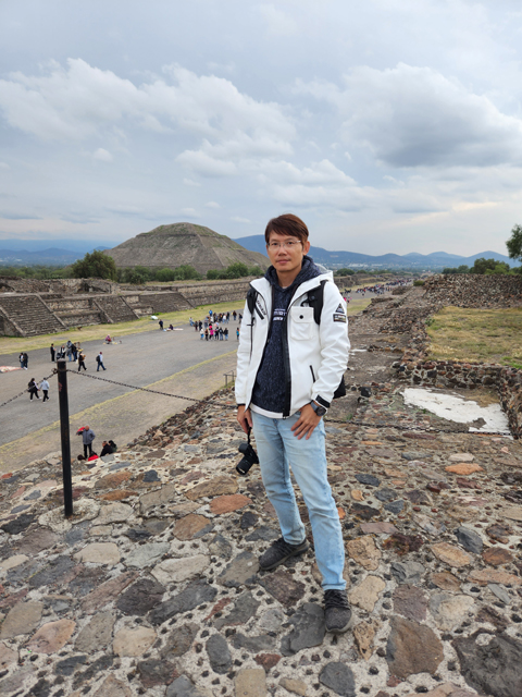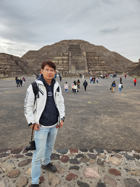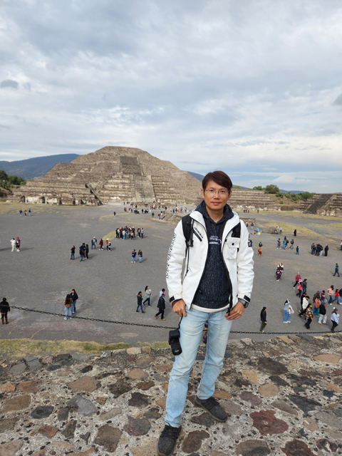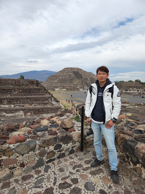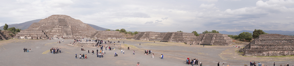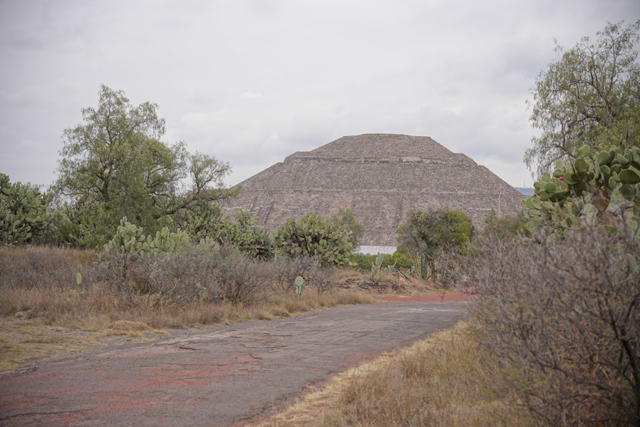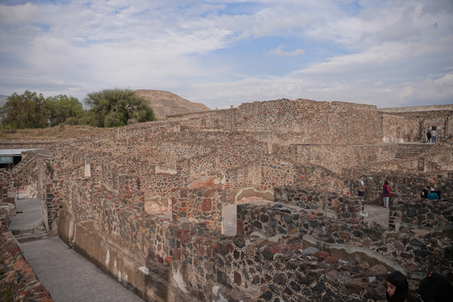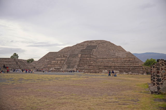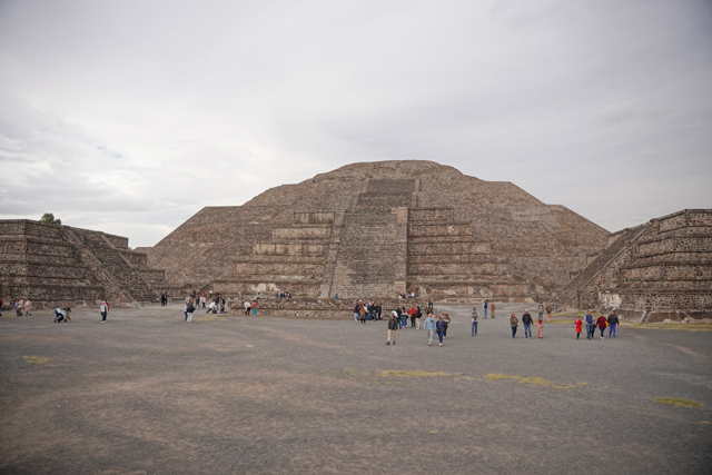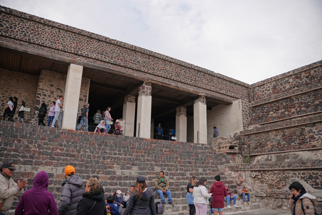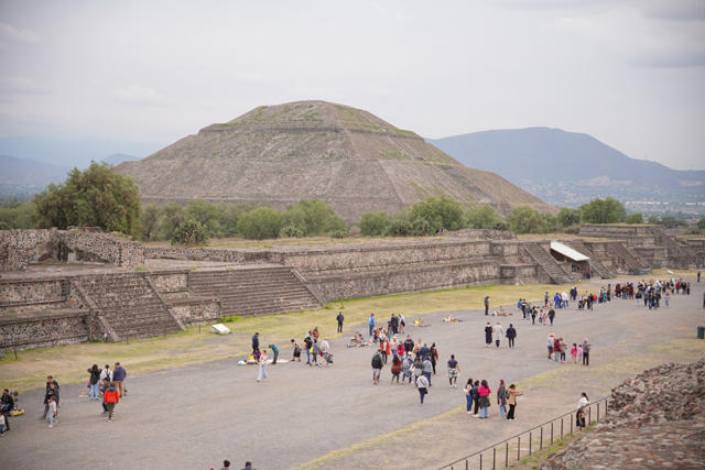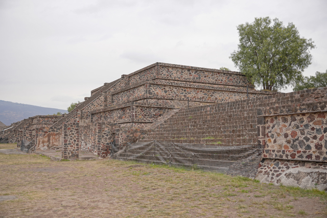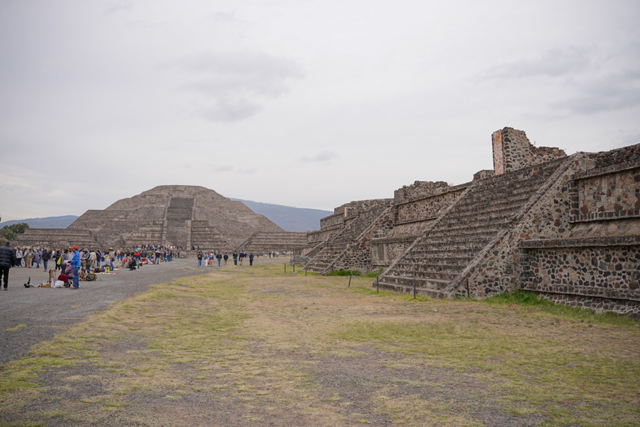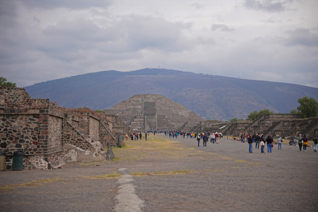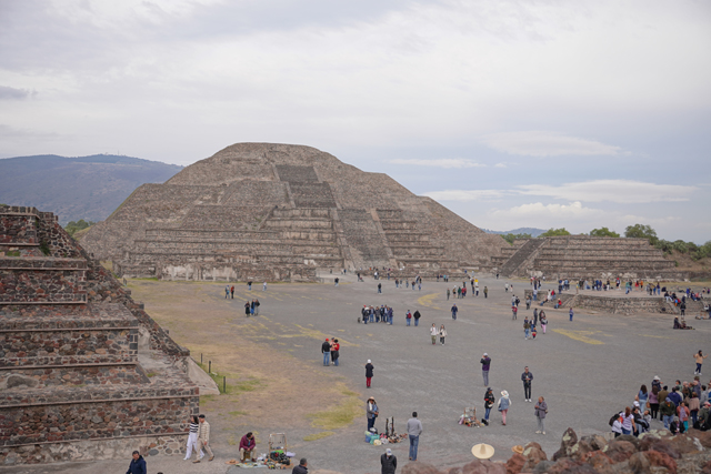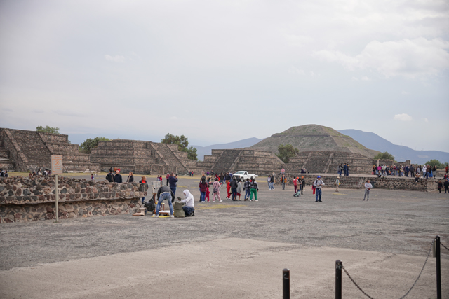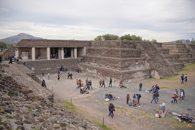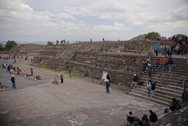 或許接收到的怨聲太多,廣場西南角的階台被選定獻祭,給遊客填補遺憾。循路攀上,已有不少人在頂頭休憩、拍照、各處賞望。十多公尺的高度自然無法收攬什麼壯闊景色,但也算提供了不同視角,欣賞「月亮金字塔」的層疊切緣、與諸小壇的搭襯。當換個方向,便是遊客如蟻般來去於筆直大道,而「太陽金字塔」踞坐著,和遠山相織連。