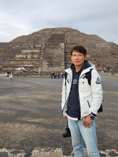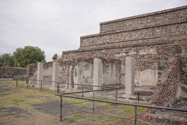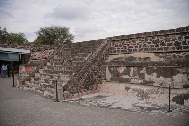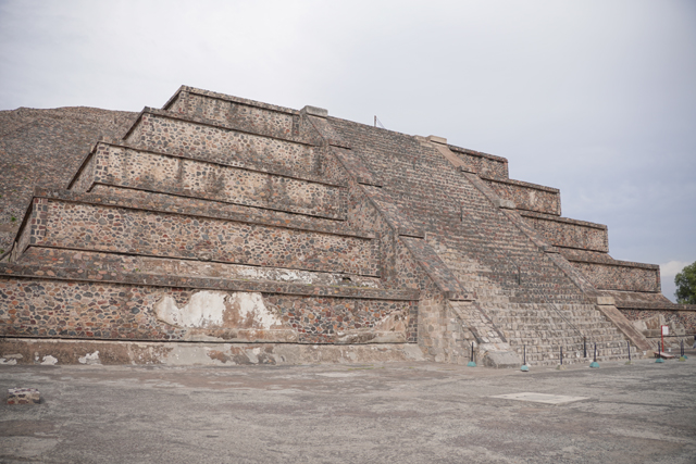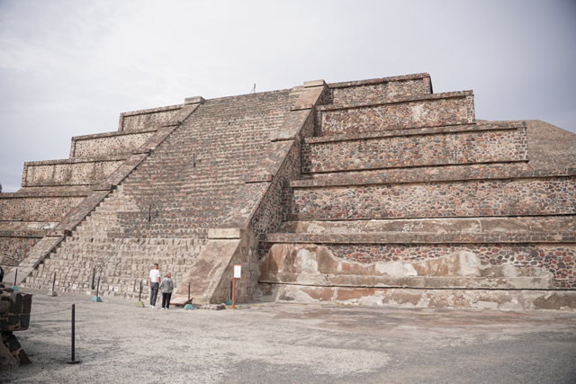 行經中央祭壇,瞥過同位於軸線但用途不明的一區殘礎,四十三公尺高的「月亮金字塔」在我面前聳立,雖遜於其東方夥伴,望來依舊巍峨。經過至少六次添建的它有著更長闊的前台,階路也不再迂迴,直接筆直上劃。在開放登爬的時日,接連挑戰這兩座,應該很令人腿軟吧,但得不到的總是最美,現今被擋在階前的我只能仰望著,想像攻頂後,「亡靈大道」以摩西分海之勢推開諸塔殿,逝於荒野茫渺處。