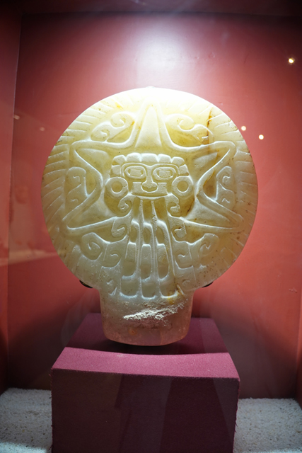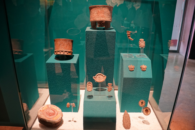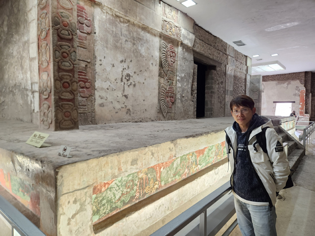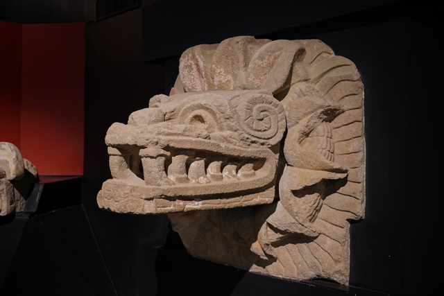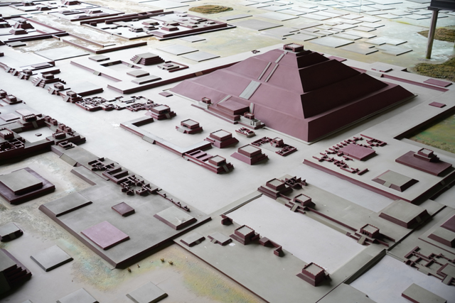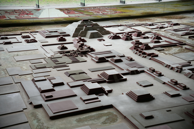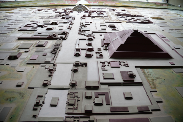 如此繞到博物館另端,便會進入令人訝目的模型廳,巨大的城市模型在腳下攤展,能藉由架高廊道,像神一般俯瞰。落地窗引入的日光勾勒著「月亮金字塔」,讓「亡靈大道」彷彿是道光流,中段的「太陽金字塔」自然是最吸睛者,塔頂祭殿被還原,塔前配襯亦完整了原本樣貌,現今的荒蕪地都佈滿以小廣場為核心的區塊。轉個方向看「羽蛇神廟」,十五個小殿如同侍衛,在平台整齊繞圍,主廟金字塔紅藍層疊。雖看不見令其聞名的雕琢,已顯君臨氣勢。我辨認著建築,拓想著高台陷地進一步被房宅密織,待了好一陣才朝館左半部續走。