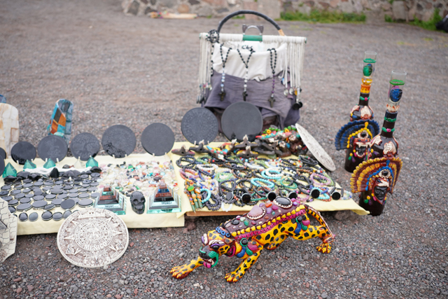 回到「亡靈大道」步往北端的「月亮金字塔」,從這角度望去,它便像遠山「Cerro Gordo」的縮化疊影。這挺符合中美洲人的「神聖地景」概念,將醒目的山水挪入城市,以建築佈局來表現。兩大塔間的遊客相對多,小販也聚集於此,有些藝品滿有意思,若非體積攜運麻煩,放家裡太佔位,差點就想掏錢。然就跟在「奇琴依查」一樣,鷹豹口笛的魔音穿腦又來了,不是來自小販的示範,就是孩童的反覆吹玩。