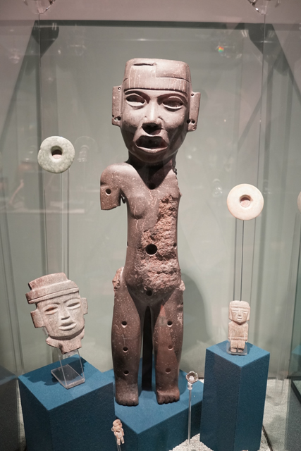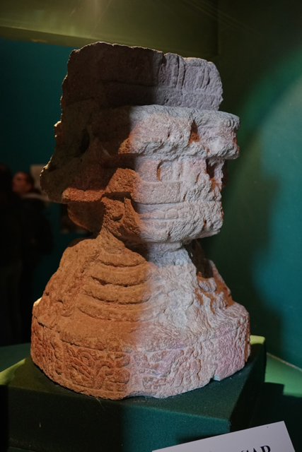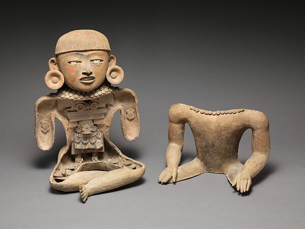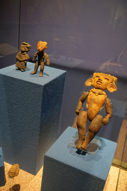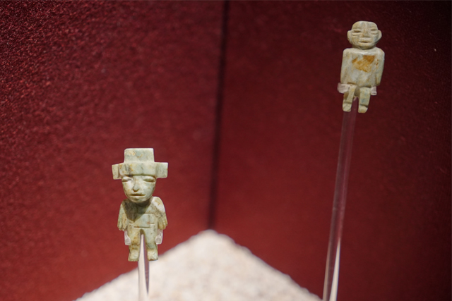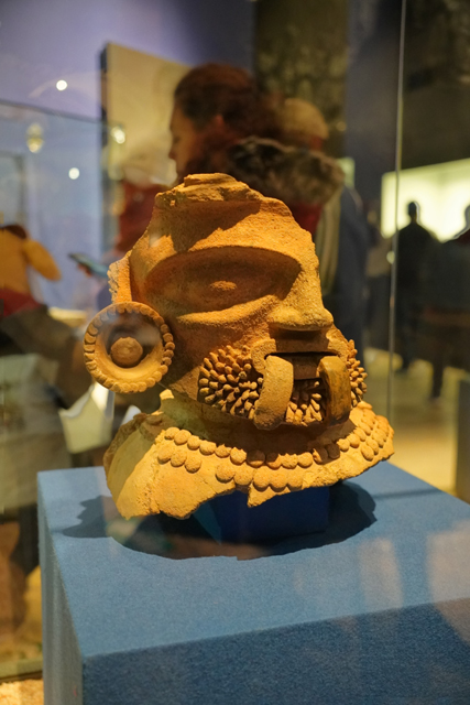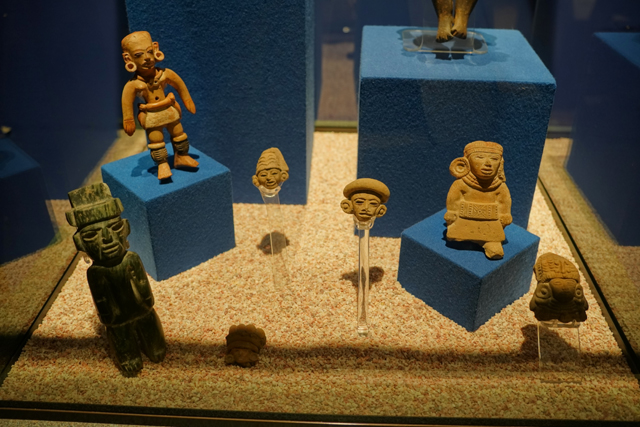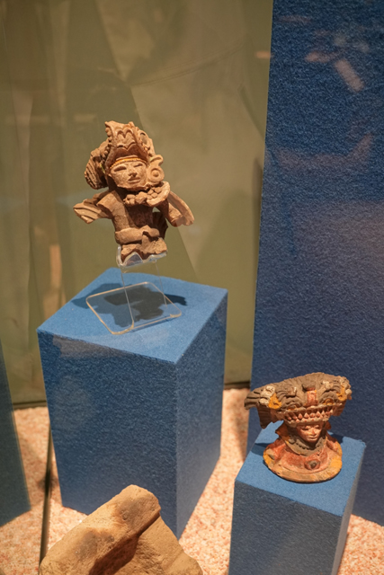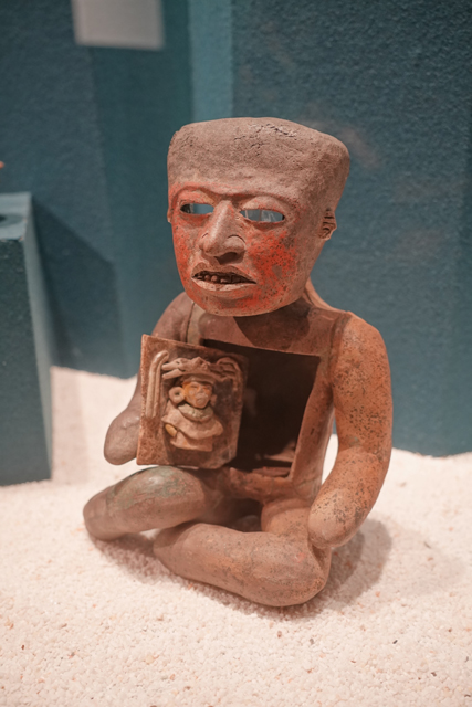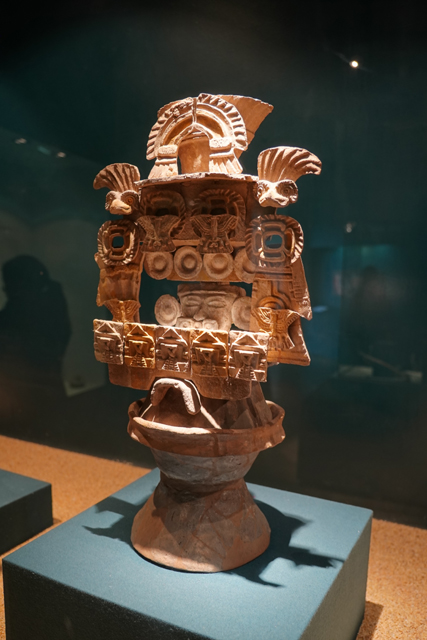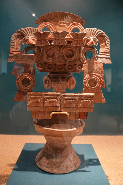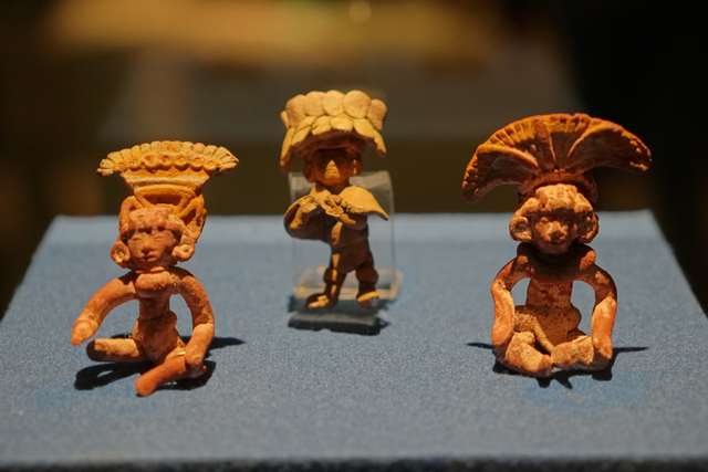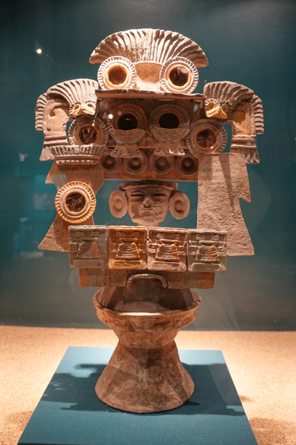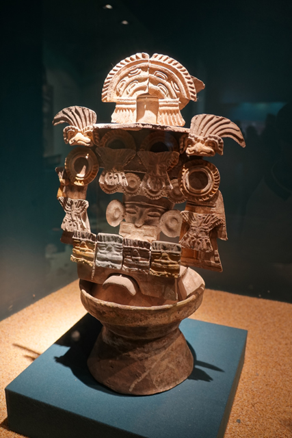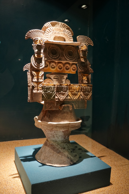 再往裡的看板,介紹了政經宗教的統治階層、手工業農業部門、貿易軍事機構,隨之展列的人像終於大了些。他們或立或坐,像走動著遞東西,某些還有活動關節給人擺弄。而對應著階級,服飾自然不同,帽冠是最顯著的差異,有的只是長條方巾,有的如泉湧花綻,能鑲上大眼、仿著獸嘴、藉鳥羽張揚的,應該是祭司們吧。香爐也出現了,被展的一尊出土於「亡靈大道」旁住宅區,雖雕成配戴巨大耳飾、珠串項鍊的蓄鬍漢子,既有分叉舌頭,應該就融合了蛇屬性神格。