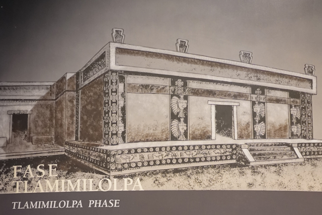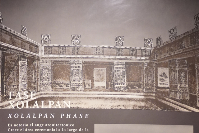 接續的牆面看板帶出歷史,以納瓦特爾語為各階段取名。公元一二世紀的「Tzacualli phase」是「太陽月亮金字塔」始建的階段,「亡靈大道」劃出了南北軸線。同樣有著「亡靈大道」之意的「Miccaotli phase」,不僅完成了「羽蛇神廟」、廟前廣場、「大建築群」,也闢出了「月亮金字塔」的廣場,並持續添建「太陽金字塔」,人口推估已有四萬五。