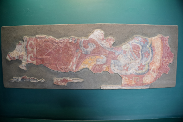 雨神同樣為壁畫的熱門主題,可惜因為性質,展出的都滿殘破,像入口就有幅說是被山丘包圍的金星,我盯很久都看不出所以然。跟香爐一起的這幅儘管眼飾獠牙鬍鬚已模糊,還算好認,他從以五角星跟渦捲裝飾的瓣狀結構探出身,嘴前有著吟唱圖騰,手中水流諸多種子漂浮,扮演著播種者。