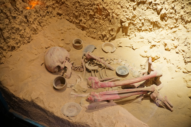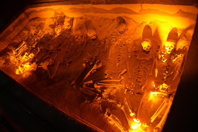 這區打光陰暗了些,應是為了凸顯其主題「墓葬」。幾個「羽蛇神廟」下的墓坑被用心還原,骨骸多半蜷縮著,手被綁在後面。很直覺認為是被獻祭,不過根據看板,當時入葬好像就流行這樣。何況他們明顯不是充數的市井小民或奴隸,項鍊竟是一串帶牙齒的下顎,意味著戰功彪炳。