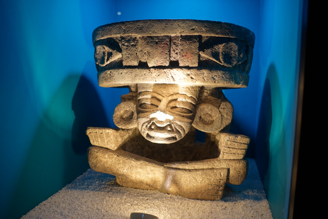 其存在感不止於此,下一間尚有被從「羽蛇神廟」挪來的他跟羽蛇神共同展示。以雪花石打造的屋頂金星綴飾也因口中噴水,背景有閃電,被認為與他相關。較特別的是附近「美學表現」的展櫃,有尊人偶竟是中空的,能打開胸腹,綻露雕在裡頭的小神。這似乎成了名為「Host」的流派,因為在網路還看到能整身開蓋的,軀幹嵌著頭冠浮誇的人物,大腿躺了兩個小的。雖是在瓜地馬拉海岸區發現,卻被認為是「特奧蒂瓦坎」文化遠播的影響。
