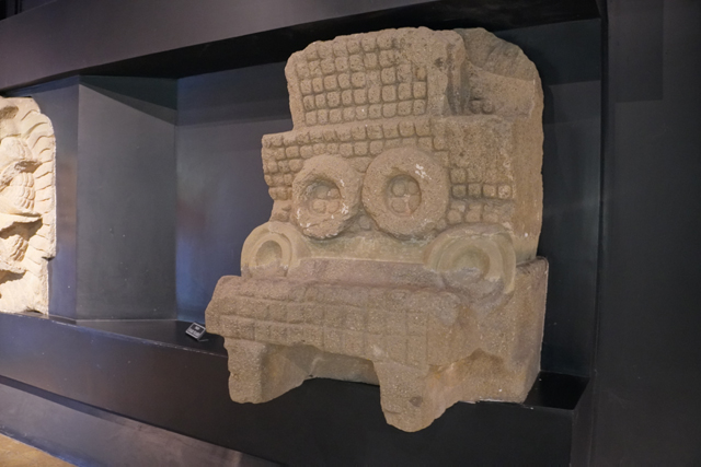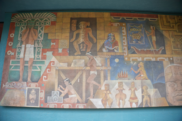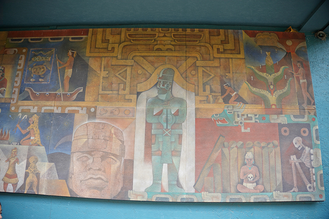 走至博物館,大門兩側以壁繪結合了中美洲諸文化,左半部偏馬雅跟阿茲特克,能看到君王、鷹戰士、「Chacmool」,及亂入的「Remojadas」微笑女娃。右側最明顯的是「奧梅克」大頭,其他對我難度太高,只能亂猜代表「特奧蒂瓦坎」,畢竟有佔比挺大的人戴著綠松石拼貼面具。