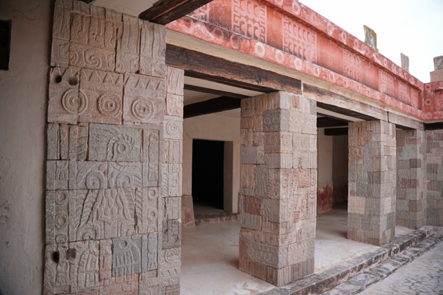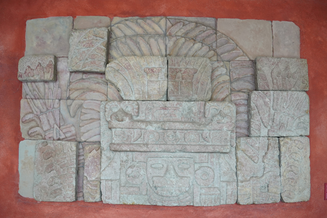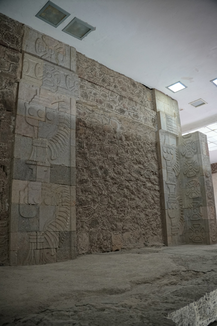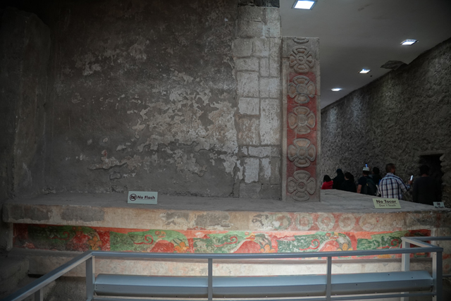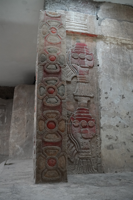 再往裡,是被埋在「羽蛇神宮」下的小神殿,稱作「Templo de los Caracoles Emplumados」。字義結合的海螺跟羽毛,顯然來自其壁面,張著側羽的大型海螺一個接一個,邊柱跟頂頭飾帶為四瓣花串接。