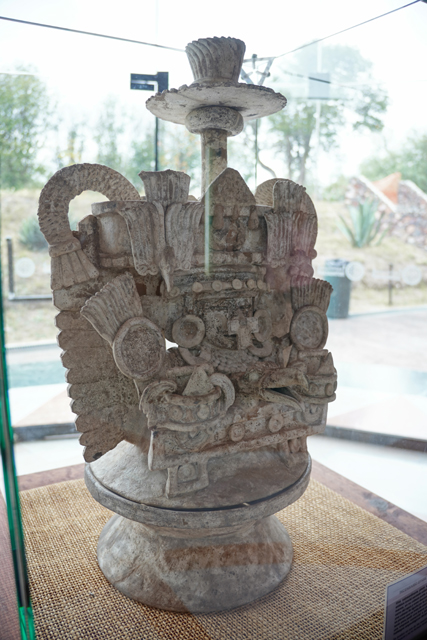 門廊中央掛了一段石飾帶,上頭浮刻的農耕神手持植物,羽冠綴著獸首鳥頭。鄰近的香爐為在「La Ventilla庭院」的新發現,它雕了占卜方面的神靈,人們藉其預測未來、祈求豐收。配件組裝得挺豐富,除了雙盾、鳥棲頭冠,胸口還嵌了鷹嘴,焚燒時會吐煙。