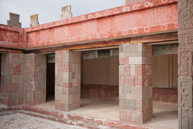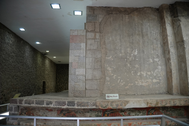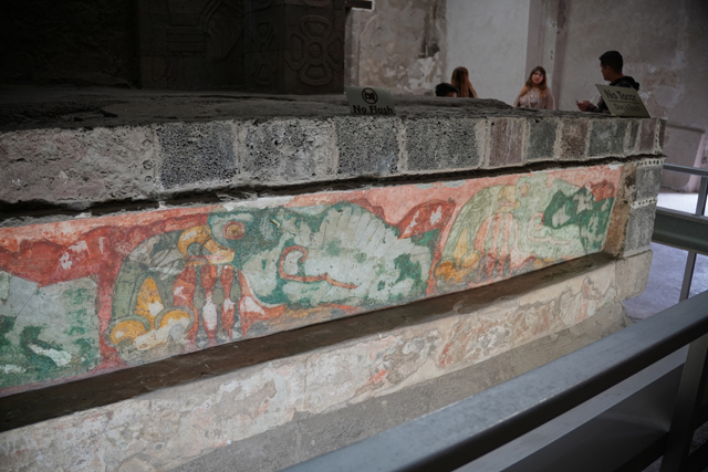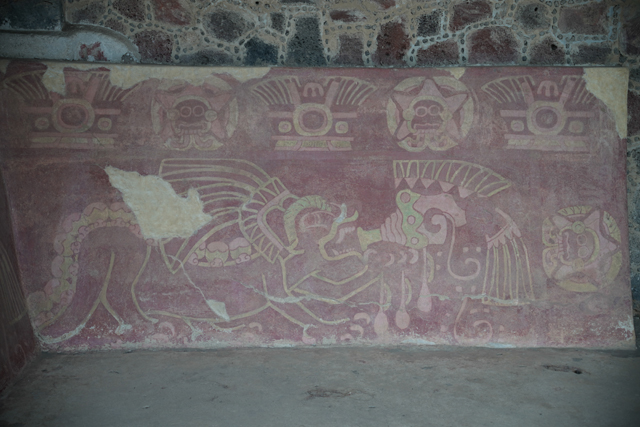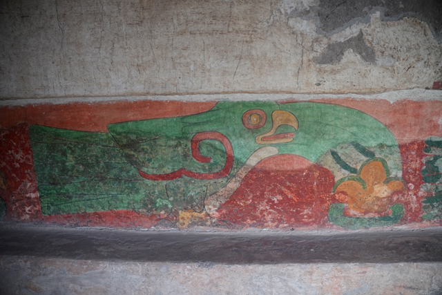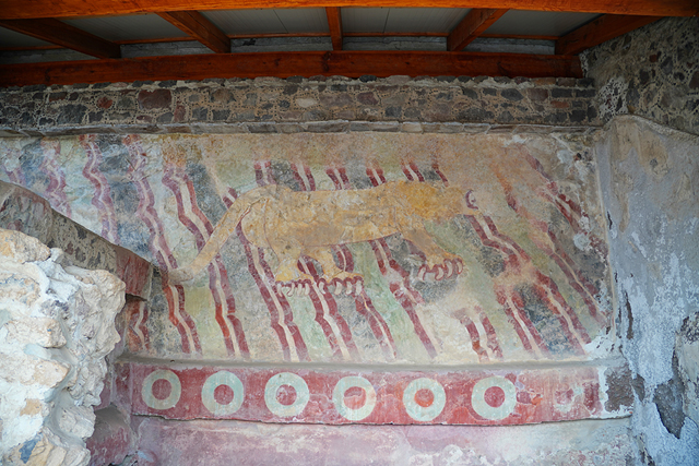 努力以東瞥西看轉移心神,路邊一個小殿很稀有地殘留美洲豹彩繪,土黃身軀清楚可辨,背景紅白綠相間,據說浪線象徵水域,圓圈是被稱為「chalchihuites」的寶石。構圖雖算不上精緻繁複,若增幅至大道兩邊的壇殿群,望來也是種斑斕風景。