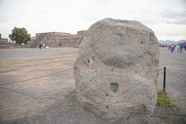過了此殿,沒多遠便是「月亮金字塔」前廣場,它有著與「太陽金字塔」不同的佈局,被十多個小階台包圍著,入口當年應有控管。而根據說明板,階台後尚有祭司們的住屋,只是皆與台頂小殿消散於歷史。