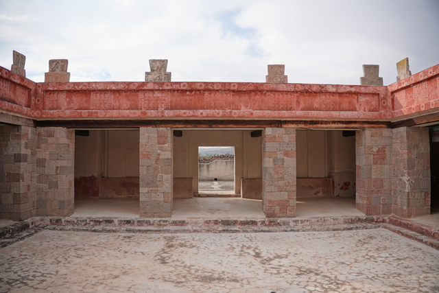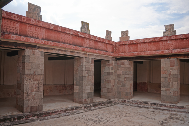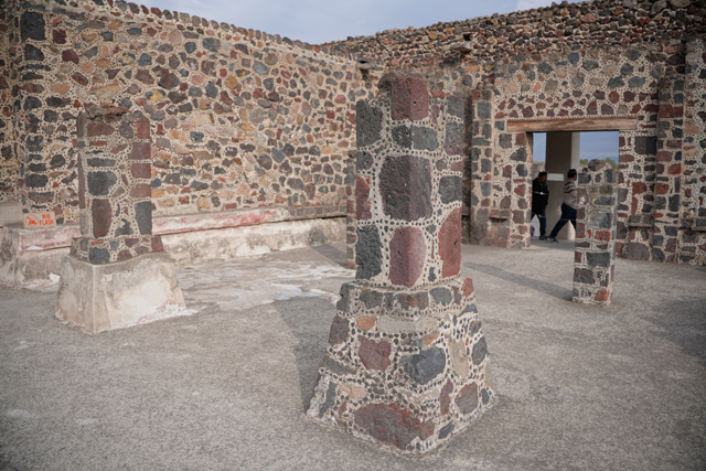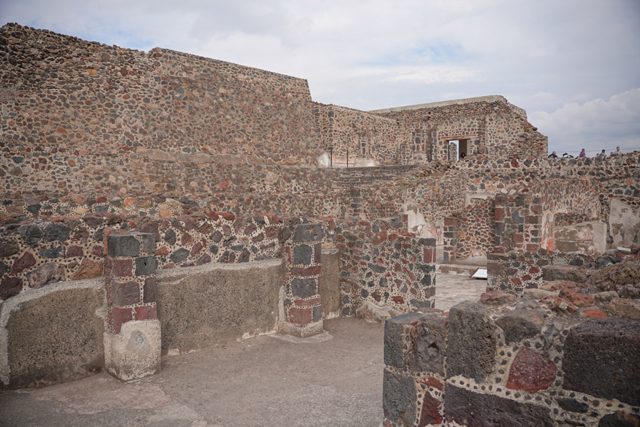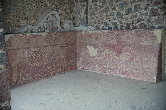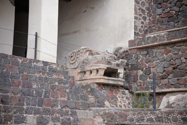 距其不遠,是一區名為「Quetzalpapálotl」的宮殿,中文常將其翻譯為「羽蛇神宮」,不過它其實是以納瓦特爾語組合了「珍貴羽毛」跟「蝴蝶」,因著宮裡妝點。入口廣階旁有個蛇頭石雕,五官精微,據說是此城目前最大的一尊。但這廣階不給人上,得從旁迂迴穿進,沿途可見滿多錯綜複雜的牆礎,且顯然有經過復原,堆石可見清晰的斑點填飾,室內的赭紅殘繪亦往上補滿了牆體。這也沒辦法,因為根據說明板,這區在當年可是被大火燒過啊。
