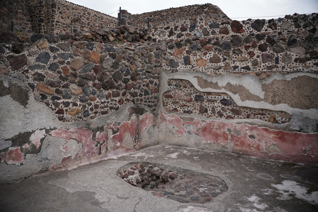 宮區範圍不僅於此,樓下還有更多房牆朝西縱亂砌築。出來找到了入口,說明板提及了這些住宅有著水槽、排水溝渠,但我只看到幾個窟洞。最謎的是上頭說的動物壁畫,看示意圖應有兩隻豹面對面咬著心臟,周邊卻頂多幾塊殘紅,是在這幾年迅速風化了嗎?