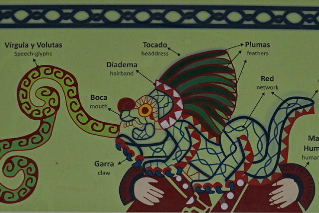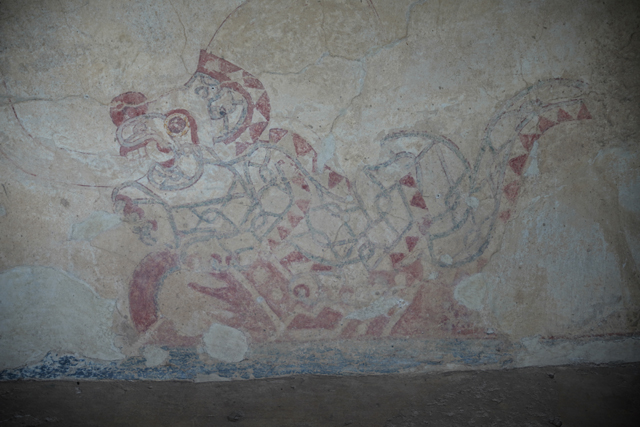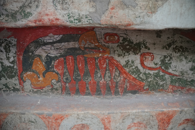 繞過一座階台,穿進的屋裡被標為「美洲豹宮」,原因也不用猜,進去就能看到牆腳一排美洲豹的殘繪。戴著羽冠的牠們跟雨神相結合,圈圈眼、手持海螺,吐出的捲繞符號跟漫畫的對話泡泡類似,代表聲音。隔壁間尚有不同形態,背脊多了一列像鱗片的東西,吹奏的海螺以羽毛妝點,周邊圈繞著星星造型的雨神。話說回來,當時君王都沒想把自己的樣貌存留下來嗎?還是經過政變,相關的刻繪都被抹除了,只剩神明?