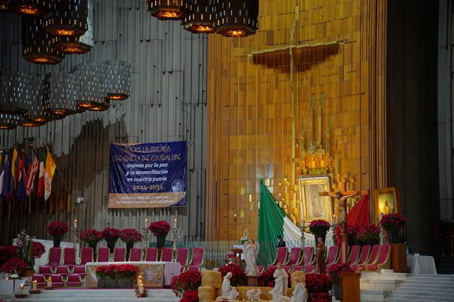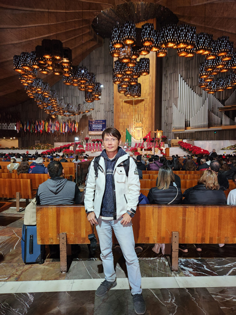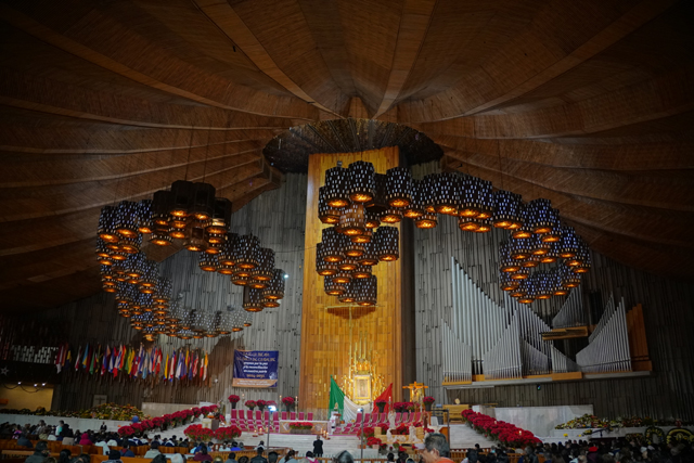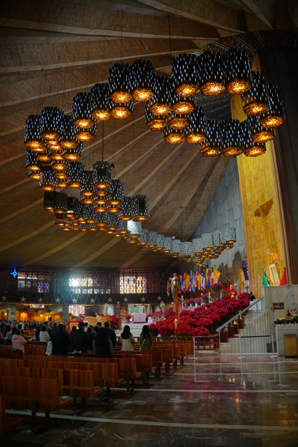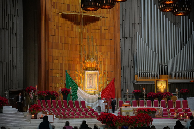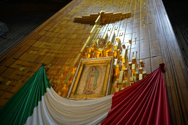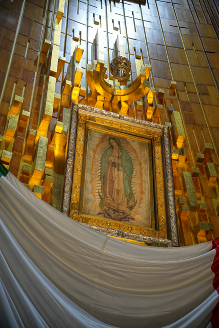 好奇穿門而入,裏頭正在進行彌撒,扇形座席信徒滿滿,後頭還站了一堆探頭探腦兼自拍的觀光客。主壇區也相當開闊,簡單飾以十字架的方柱高高撐起帳頂,令講道牧師顯得渺小且形單影隻。努力盯著牧師身後,奉在那的便是名聞遐邇的「瓜達露佩聖母像」,然在這遙長距離下,僅能看個隱隱約約,因此沒幾秒就把視線轉往天篷了。
