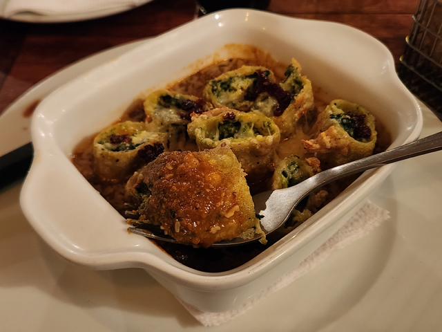 捏熄慾望,走進就在附近的義大利餐廳「Nonsolo」,其店裡光色偏昏黃,感覺更像間酒吧。會想來,是因為它有很多素食選項,且菜色新奇。將菜單來回掃讀,最後選了「Ricotta and spinach cannelloni in Tempura」,它將菠菜、乳酪、醬料包在麵皮裡炸過,再微微焗烤,上桌後很對我的味。本還要點用檸檬醬料理的花椰菜,被店員勸阻,說這樣會太多。也的確,即便入店時餓得想點滿桌,小鳥胃的我吃完這「義式天婦羅」,就舉白旗了。