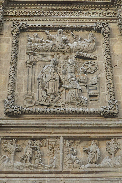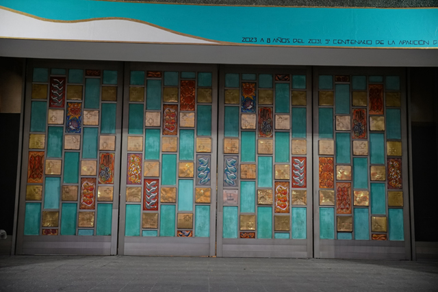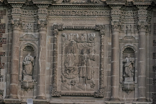 步道口的石壁配合傳說,擺了斗篷現顯聖像的造景。瞥過後循著舊堂西側往回走,這側其實有間博物館,收藏了近四千件「新西班牙」時期的文物,包括繪畫、雕塑、珠寶、金銀製品。但這時間理所當然關門了,僅有西立面供人賞望。其佈局跟南邊正門差不多,飾柱、雕板,中央那幅亦以聖母像為題,可惜我功力不夠,辨不出故事走到了哪段。
