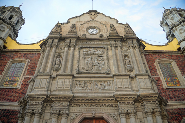 「瓜達露佩聖母聖殿」主奉的就是這幅聖像了,儘管至今還沒找到正式的文史佐證,都是傳說的輾轉流傳,仍無損信仰熱度,這丘區因之而建的教堂無數,光我踏足的大廣場,視野所及就有四座。最右邊是「嘉布遣修女聖殿」「Parish Church of Saint Mary of Guadalupe “Capucins”」,為方濟會的分支。由於以側向示人,中央拱冠靠近立面便顯得醒目,往下是簷線的折曲,藉淺浮刻增添紋路。
