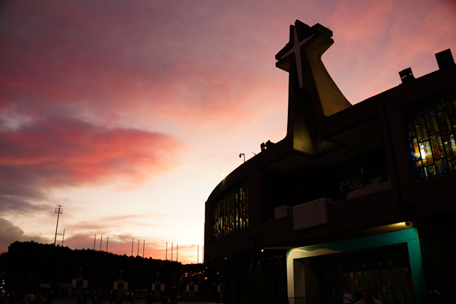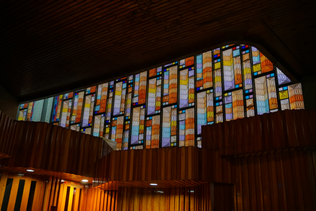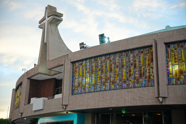 嘆氣後轉個角度,廣場最左像個巨大飛碟的就是主角「瓜達露佩聖母聖殿」。它相當年輕,才約莫五十歲,既是現代之作不免力求創新,碟狀外觀仿擬的是古代收置法櫃的聖幕帳篷,主壇所在如帳頂拉高,大門以十字架標記。環圍花窗不再描繪聖經章節,僅以立體長條色塊拼組斑斕。之所以會有這間,是因舊堂仍存在著重修也解決不了的結構問題,二十世紀又有反宗教的激進分子在壇前引爆炸彈,雖然十字架幫聖母像擋了劫,免不了令舊堂傷上加傷,就索性蓋棟更大更新的,以容納數量越來越誇張的朝聖客。