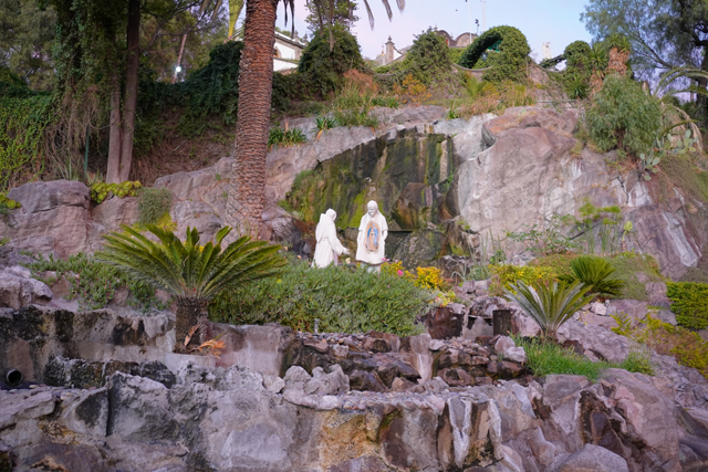 離開聖殿,經過「若望保祿二世」雕像,我按照預想,朝位處「Tepeyac」山丘的「Capilla del Cerrito」走,它的砌建顯然是為了更貼近顯靈之地,量體雖不大,看資料,中廊亦飾滿了精湛壁畫,描繪聖像引發的各種奇蹟,除此之外,堂外還有看台,適合在這日落之際,居高欣賞城區的光影轉換。哪曉得才走到步道入口,警衛就把鐵門無情關上,很令我傻眼。疑惑地查了開放時間,呃,還真的僅開到六點。只能說被望台那堆捨不得下山的人誤導了,以為就是設計給人看晚霞跟夜景,會開到頗晚。也罷,走了一天腳痠死了,要爬上去其實也很懶。