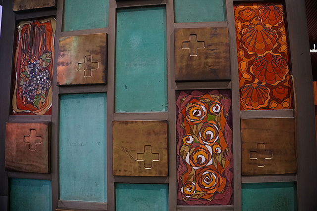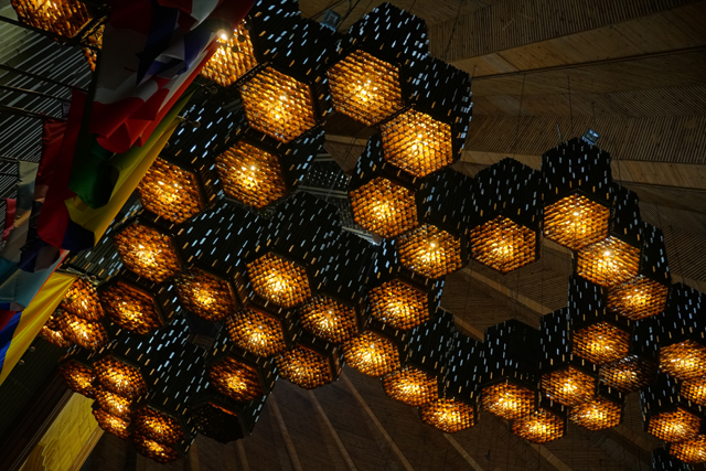 在那兒高掛的懸燈群相當特別,以六角柱形樣拼組,帶出兩段不規則拋弧,網狀溫黃光源如複眼,組合一起又有點像蜂巢。不太知曉其創作寓意,但既用在教堂,應有更適切的指涉吧。即便推敲不出解答,這樣的藝術感自帶幻力,且隨著角度挪移,都將主壇勾勒出不同風景。我盯望了許久,才終於回了神。