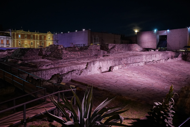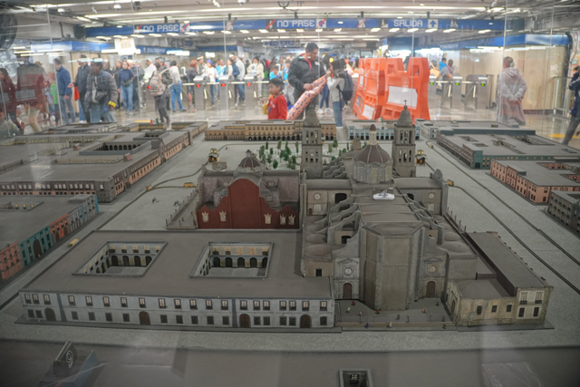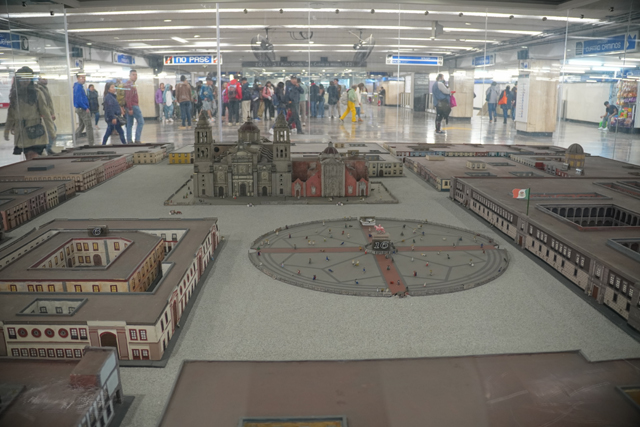 出來後的天色已被覆上一層墨黑,教堂帳頂被投光炫亮著,而環圍花窗因室內的點燈,反倒比晝時更加繽紛。在瞥看間慢慢行至地鐵站,搭了一段回到市中心的「憲法廣場」。這邊的站點還滿用心,擺了三座大模型,前兩座能見主教座堂的輪廓,一者記印廣場1900年時的林樹扶疏,另者為1824年以圓形圖騰圈圍著「卡洛斯四世」騎馬像。第三座則將時光逆推至西班牙人到來前,有以「大神廟」為首的諸塔散點。