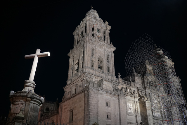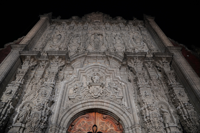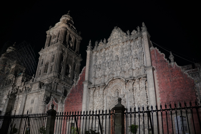 出站後朝主教座堂走,其正面在夜裡依舊悲情,鷹架看起像蜘蛛吐絲,幸好還有同伴「大都會聖幕教堂」撐住場面。再次欣賞它的立面雕繪從南拐至東,窺望退縮在小花園之後的座堂東翼,鄰近是昨天才拜訪過的「大神廟」遺跡。本想在外圍繞繞,補足當時沒看到的,但這兒打光不足,細節都隱在夜色裡徒留哀淒,盯幾眼便決定放棄,畢竟一整天只在坐巴士時塞了餅乾,正在抗議的腸胃不斷催我去覓食。