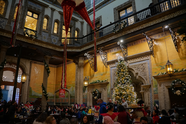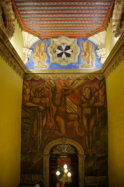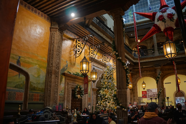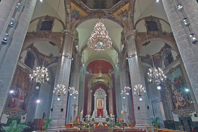 也的確,雖以基督為名,它可是上一代的「瓜達露佩聖母聖殿」,長久以來聖母像都奉置於此,內部裝飾不免拉高規格。它曾因隔鄰的砌建而受損,重修時,堂裡便隨潮流改走了新古典。大理石主壇支起青銅拱頂,掛懸基督聖像,各拱頂的拱肩有諸先知俯望。壁面幾幅大型掛畫是其亮點,記述了聖母像現世後的事蹟,包括原住民的皈依、梵諦岡教宗幫其加冕。往內拐個彎,尚有「聖體聖事禮拜堂」,墨色精雕的唱詩班席於兩側列陳,金色龕室聚焦著銀亮的聖體櫃。哪曉得當抱懷期待,走到門口,它居然沒開。怪哉,表定是八點關啊。疑惑中剛好有人從裡推門走出,我便問了他。