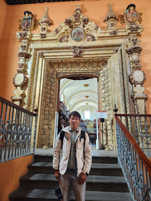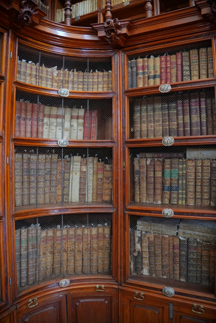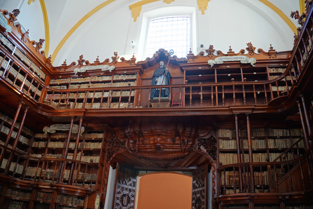 圖書館不大,也不像歐洲某些刻意華麗,它留白了天穹,將主角交給環圍的褐木書櫃。原本藏書僅有宗教類,後來逐漸包羅萬象,歷史地理詩歌數學兼具,共超過四萬本。不太清楚目前的借閱規則,反正我們觀光客也只是來感受裝飾氛圍。據說書架用了三種木頭巧妙拼組,櫃架跟護欄持著簡潔線條,櫃頂翻起渦捲,間隔著洛可可的焰狀翻騰,看起來頗像一個個花瓶。