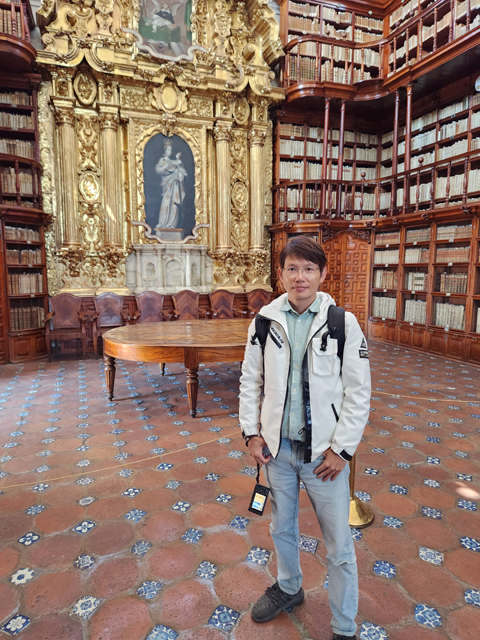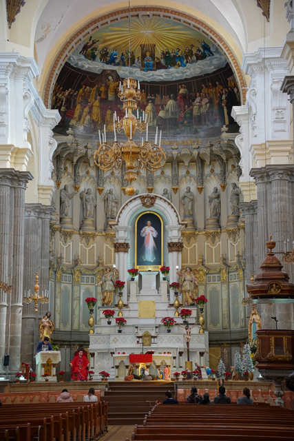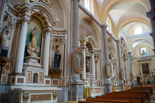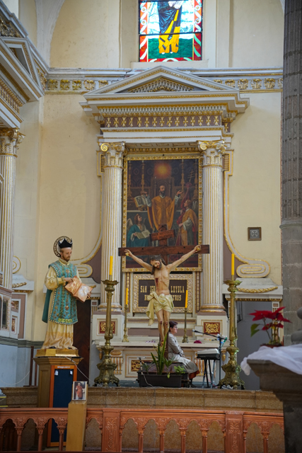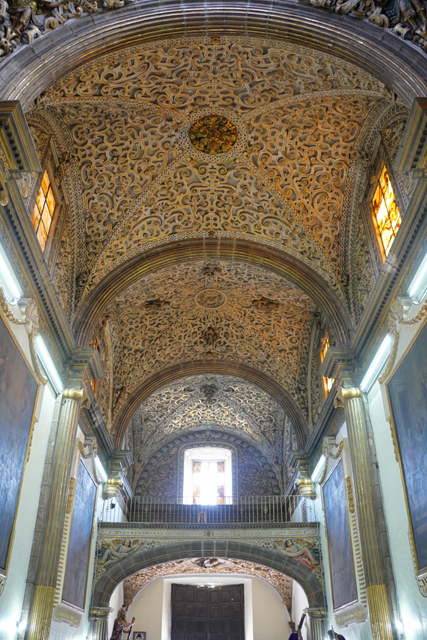 由於前兩間教堂看太久,圖書館就無法多待了,繞過一圈,稍稍感受歷史韻味及與書香揉雜的木質調,便得朝下個目標推進。我望著座堂側背及邊角拱頂,穿入東邊綠樹成蔭的商街,再拐往北,飛挑的鐘塔標的著「聖靈贖罪聖殿」(Templo Expiatorio del Espíritu Santo)。它於十六世紀由「耶穌會」主導砌建,並在十八世紀經歷了大改造。