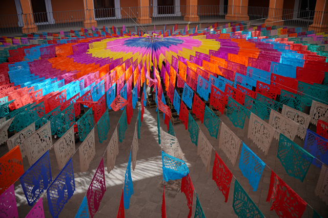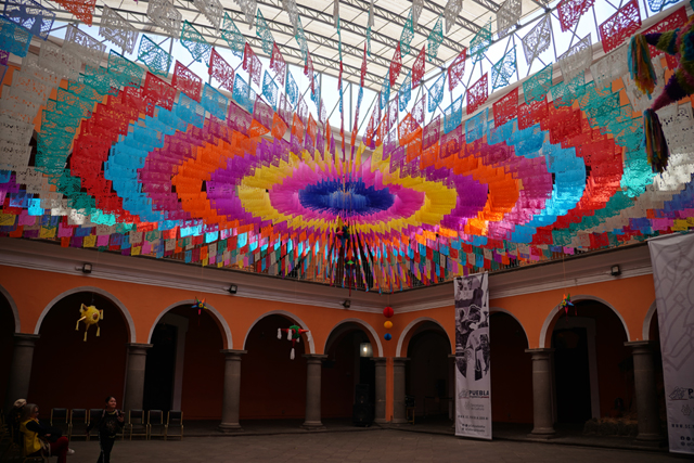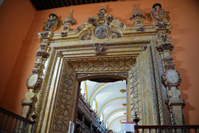 它入口不太明顯,我是先誤入了遊客中心,詢問過後,才知要從隔壁標有「文化中心」(Casa de la Cultura)的門進去。其中庭放射狀懸掛了彩色剪紙,頗為瑰麗,二樓館門框邊亦有設計,由花團起始,不同紋樣朝外推擴,最外層竟添入「丘里格拉」柱式,擁有多變的繁雕節理,並於門額冠上獎盃模樣的綴飾。