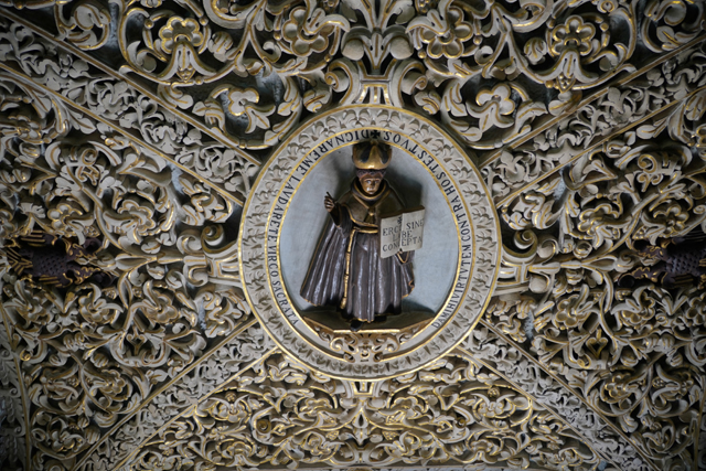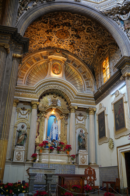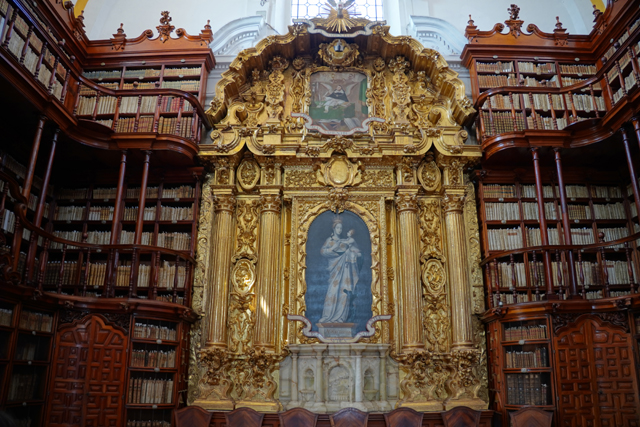 思考無果後續往另端走,這兒設了獻給聖母的祭壇,金耀燦爍。有意思的是一般多以雕像或畫配襯中列主角,這邊兩側卻成「丘里格拉」的展演場,溝槽柱間夾著它的曲流線條與花框,弧頂也被其縮小版列併填飾著,再加上書櫃護欄在此特意的拋彎,很惹人盯瞧。