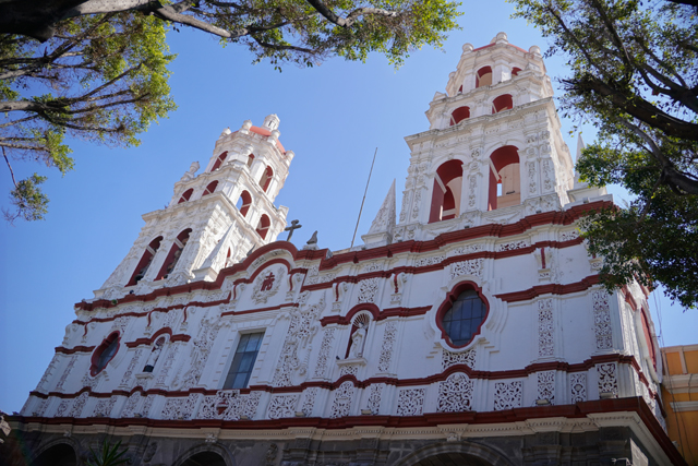 接續的目標「聖克里斯多教堂」(Templo de San Cristóbal)距此三個街區,前身是家收養孤兒的醫院,堂名便來由自創院的慈心神父。朝北走了過去,它同樣有雙塔招引視線,且塔身頗具雕琢。飾柱採用別致的雙螺旋,在光滑與藤紋間交替,窗台呈弧形外推也滿稀有,再加上兩層稍稍的變體,錐尖及雕像的配襯,很惹人抬望良久。事後查了資料,它竟是舊塔被宗教戰爭摧毀後於近代補上的作品,沒因此標新立異或走極簡,而是基於古式作翻玩,相當難得。