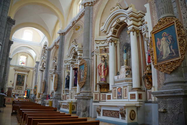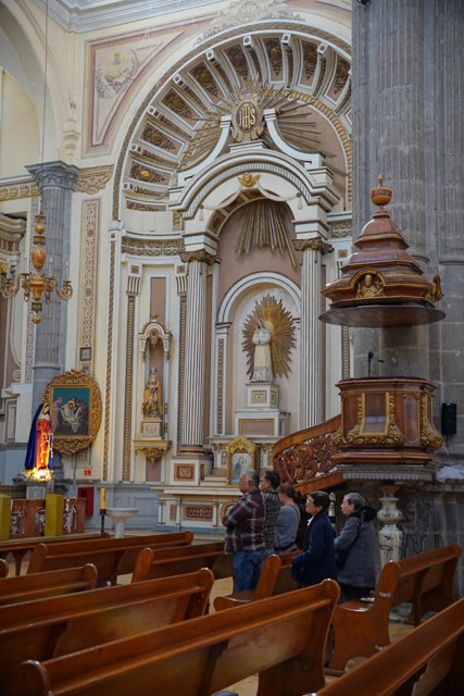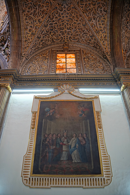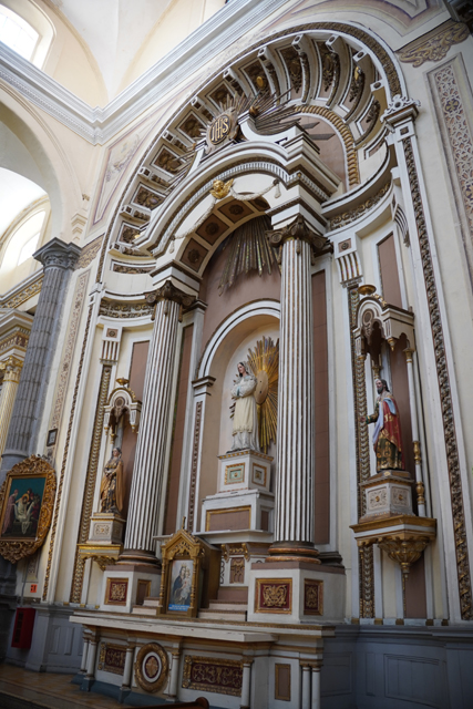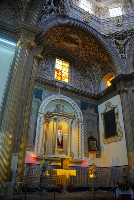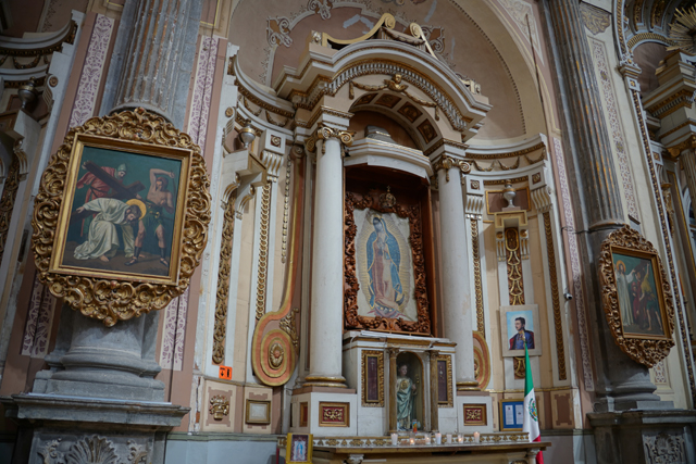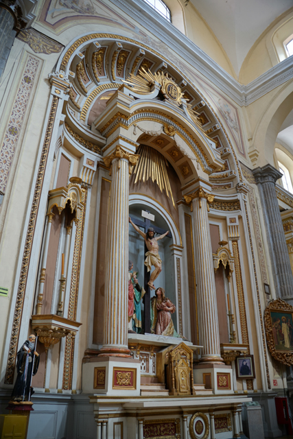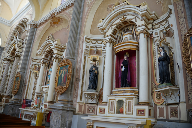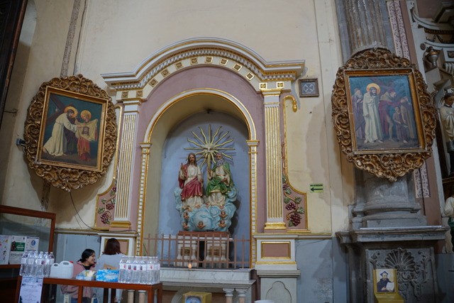 相較中廊,這兒壁柱多了「苦路十四站」的小畫裝飾,龕室風格經過統合,都有著巴洛克的抱擁弧面,再冠上弧頂。但它們並沒走繁雕路線,就是些大渦漩跟金色綴邊,猜想是因風潮已漸轉向新古典,但也難保不是主導者的偏好。這間有點偷懶,龕室都沒貼標牌,根據我自己的知識庫,北側在櫃台後的是以聖父聖子聖靈呈現的「三位一體」,往東依序有抱著小耶穌的「聖安東尼」、熟悉的「瓜達露佩聖母」畫像。耳堂的規格拉高,多冠上貝殼外緣跟光焰,奉的是「十字架上的基督」跟在旁難過的「三瑪麗」。
