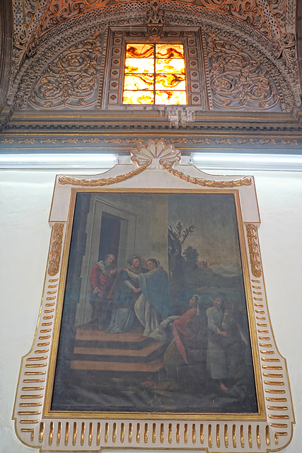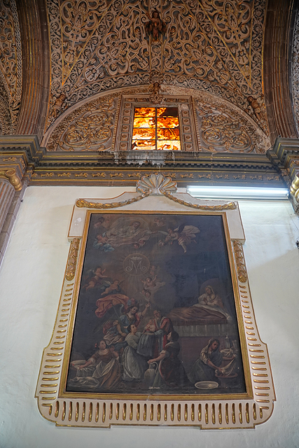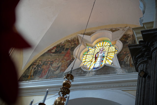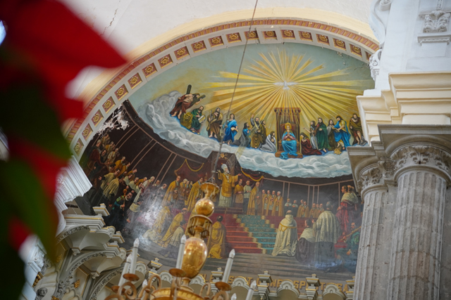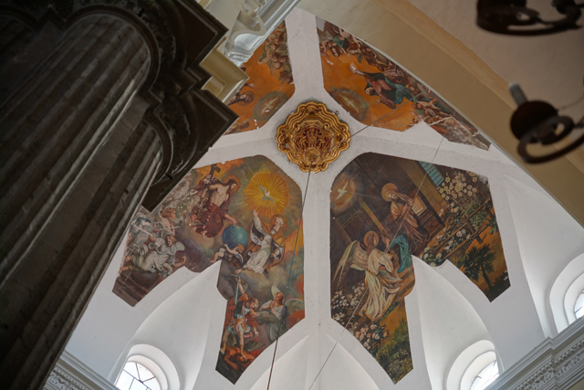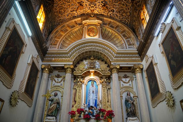 往前走,兩側有著大幅面掛畫,色澤雖黯淡,仍能辨出是聖母生平,她的誕生、進聖殿、與聖約瑟結縭、拜訪伊莉莎白。不意外地,主壇所奉的也是她,身穿白藍衣袍顯著慈愛。循著頂框的層層耀芒往上望,中央拱頂浮雕著「聖母無染原罪」,周邊有諸多天使手持不同樂器,與殉道者們就彷彿替代了花,在緻密纏藤間朵朵開綻。