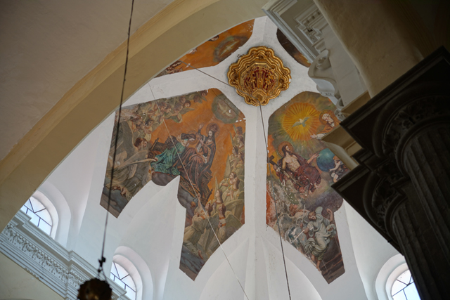 主壇的配襯不僅於此,兩側尚延伸了副壇,描繪「耶穌會」創始者「依納爵·羅耀拉」與「方濟·沙勿略」,中央拱頂也出現彩繪,瑰麗呈現《天使報喜》、《聖母升天》、《聖母加冕》跟《三位一體》。可惜柱後的視角實在過於侷限,我只不過多挪了一步,講道中的牧師便瞥了過來,眼中似有著「哪來的大膽傢伙」。