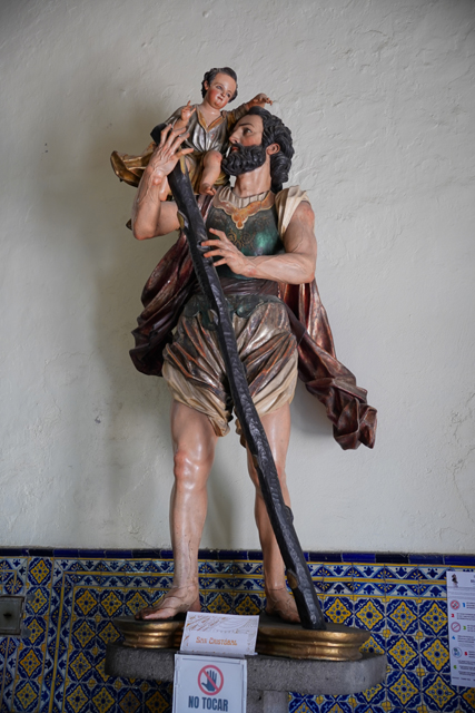 跨進大門,這間是沒在彌撒,但也完全無人,如此的冷清不太合理,畢竟廳堂設計得滿亮麗。類似一早去的「玫瑰聖母禮拜堂」,拱頂佈滿了纏藤鏤雕,像等待綻放的花棚,將人引向末端的主祭壇。朝左右瞥看,門口一側放了扛十字架的基督,另側掮著小孩的男子是跟堂名所指神父同名的「聖克里斯多」。