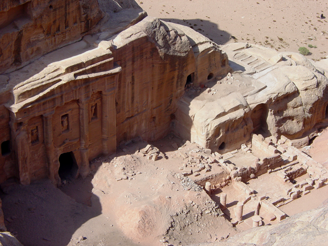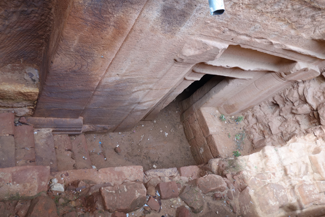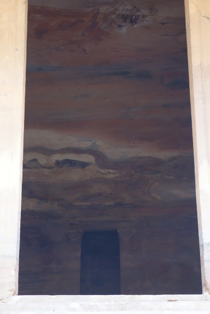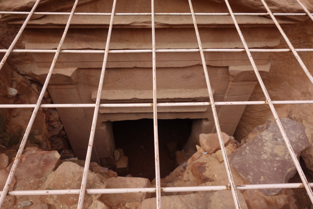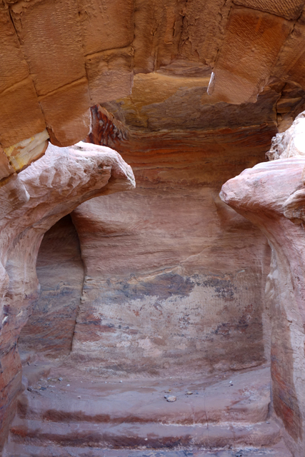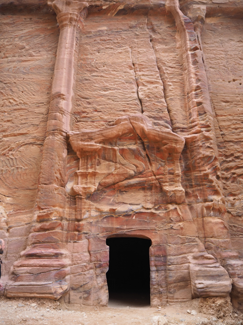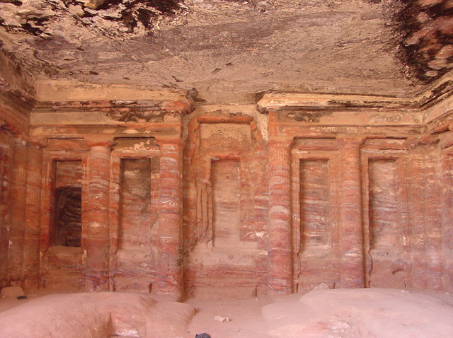 然把寶藏庫蓋在城市的入口,怎麼想都不合理,學者們再三研究後也覺得它應是間墓堂,屬於一世紀的王「Aretas IV」。他與「希律王」間有著微妙連結,因為「希律王」兒子就是休了「Aretas IV」女兒後另娶兄嫂,導致後續「施洗者約翰」被砍頭。即便書上都說堂內空無樸實,只有簡單小室,也註明遊客止步,我仍舊不死心湊到廊前,先瞥向似是不久前才被開挖的地下層墓室。從讀過的印象,由於千年來隨雨季洪流沖來的亂岩不斷堆積,目前所見的廣場其實是近代修平的,下層墓室的重現是種佐證。所以主墓原本設計就是高懸於崖壁嗎,為防侵擾?