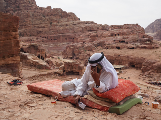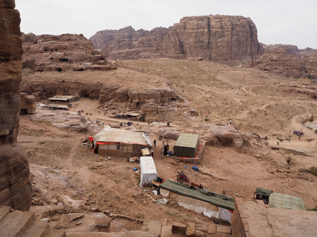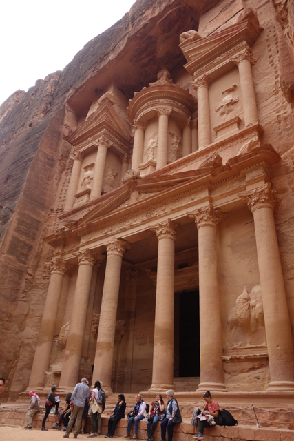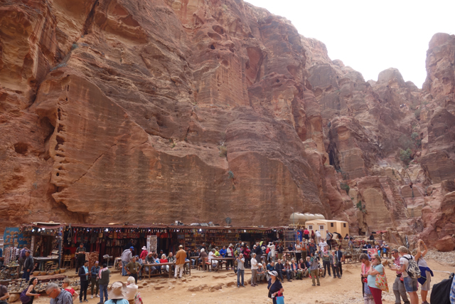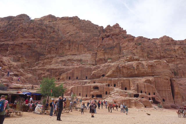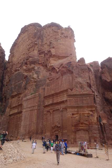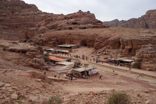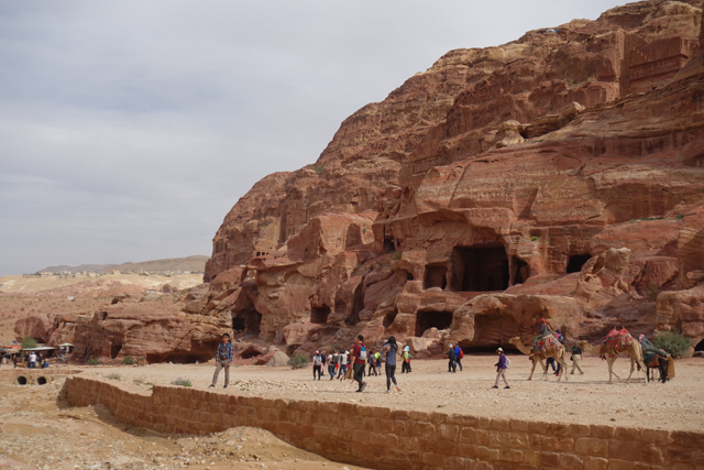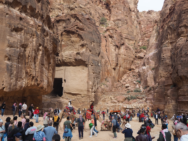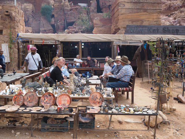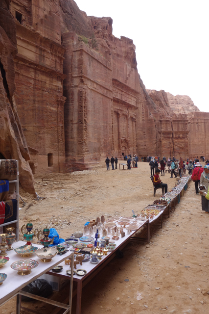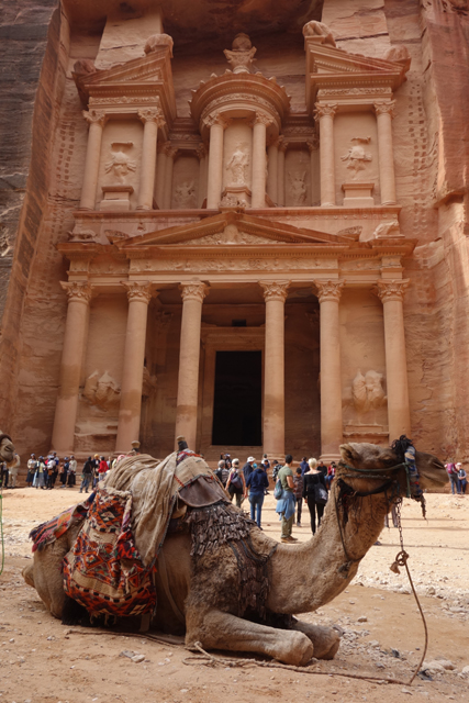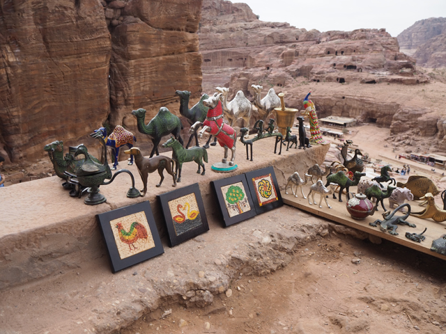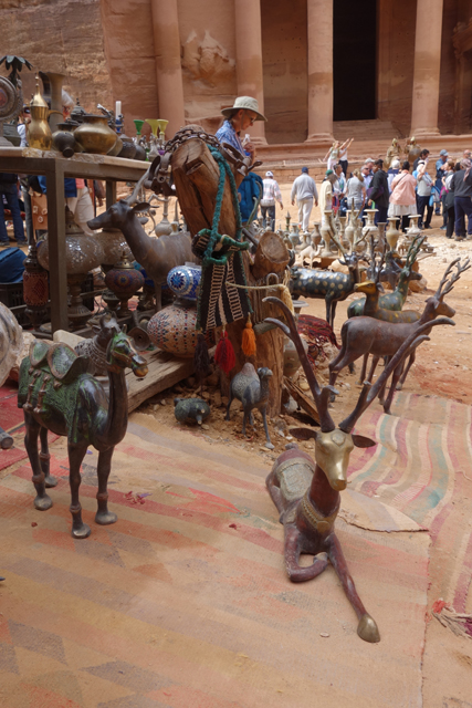 如我這樣的觀光客來「佩特拉」,多半是為了在「蛇道」後乍現的這棟偽「寶藏庫」,或賞望,或回味年少記印。貝督因人自然也聚集於此,將各色彩繪瓶罐、動物銅雕擺得琳瑯滿目,紀念品店、飲料店設了座席,讓跋涉的遊客歇腿之餘打開錢包,連駱駝也被牽來廣場棲坐著,與身穿盔甲的衛兵們賺點合照小費。只得半日空檔的團體通常就是在此待個一陣,便算功德圓滿,可打道回府,但這兒其實僅算「佩特拉」的門面,要對它多所了解,還得再往裡走。