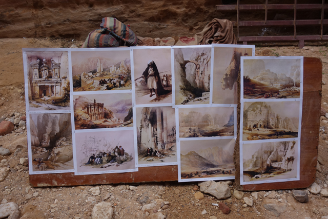 由於這區相較「寶藏庫」那兒腹地廣闊,商家餐廳又更多了,也有難得的公共廁所,在等候大家解放之際,我四處轉繞著拍照,也打量著攤位上的商品。沙瓶不意外是最大宗,但感覺在削價競爭的氛圍下,品質不算好,風砂吹襲也使其陳污,反倒是主打掛畫的讓我盯望最久。那是畫家「David Roberts」於十九世紀遊歷中東埃及時所繪,雖僅為翻印,仍是種懷想的憑藉,可以一窺蛇道入口曾有的弧拱,了解「寶藏庫」的無瑕廊柱原來是從殘斷復原,雕像身形則比現在清楚,彷彿百年的人禍比千年風沙還更鋒銳。此外另有幾幅我尚未踏足之境,荒岩殘殿,搭配身著帽袍的貝督因人慵懶點綴,早先看網友介紹就很喜歡,但盯了幾許,想著還有大半天要走,拎著一疊畫紙實在不便,只能勸著自己回程再買。