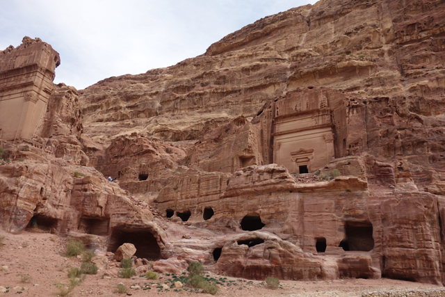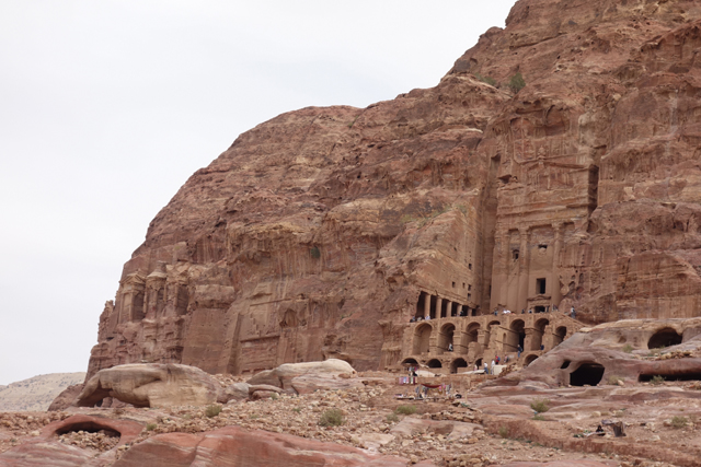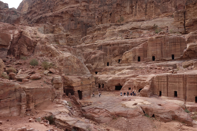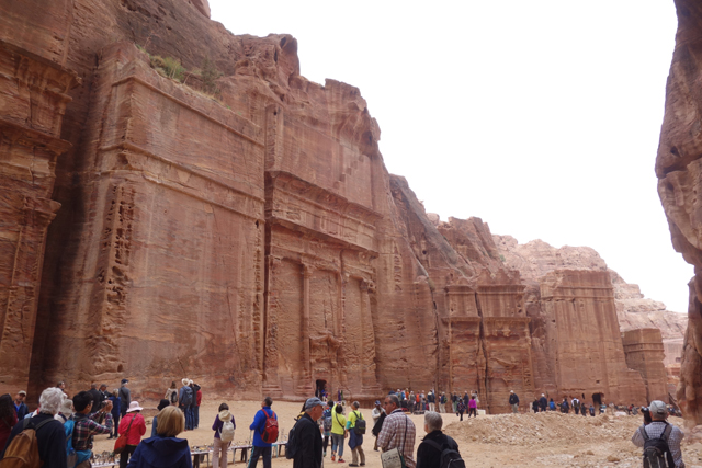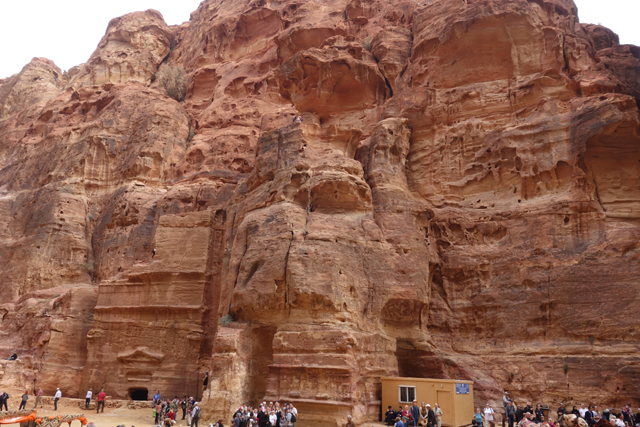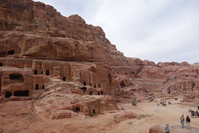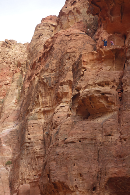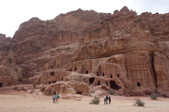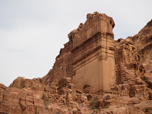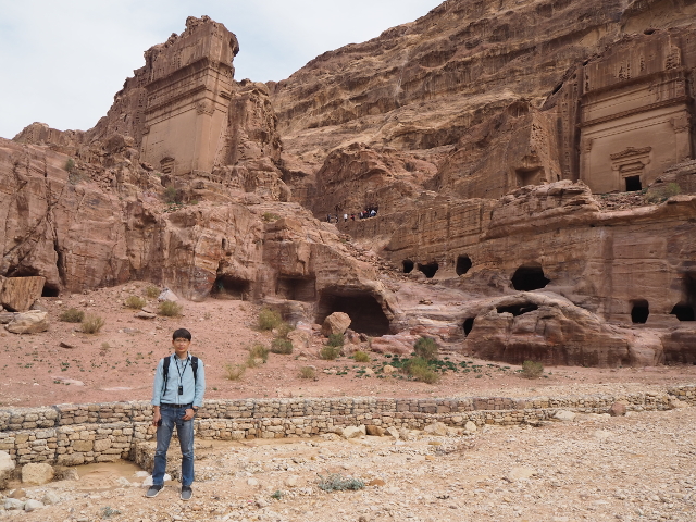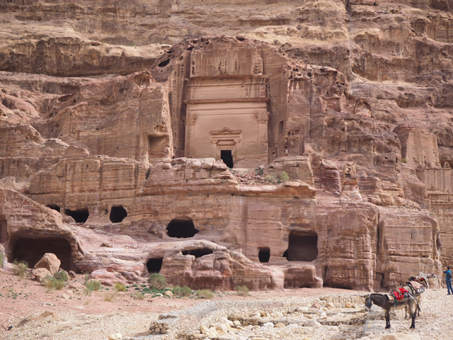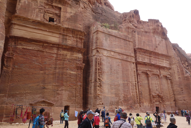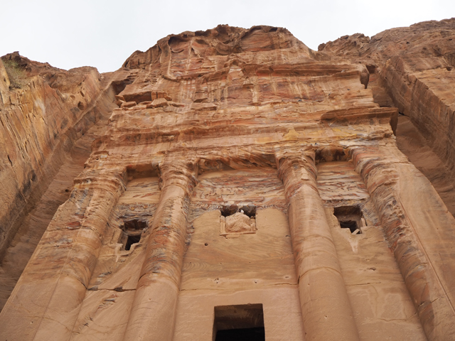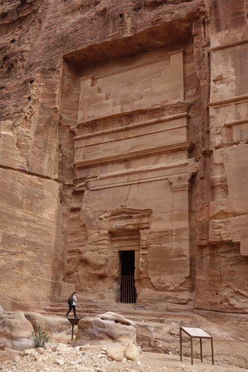 隨著導遊的招呼,我們走入右側的另條道路,漸漸地,粗糙岩壁現出許多人工切削,立柱橫楣為框,中央鑿出門洞,像樓閣般整齊比鄰,若添上門牌櫥窗便成為熱鬧商家。這樣的陣勢讓此區得了個名號「立面大街」(Street of facades),彷彿城市居民多半群居於此,不過就跟前頭的「寶藏庫」一樣,這些壁中樓閣也都是墓室。儘管如此,立面的雕鑿仍值得端詳,不單是展延壁面曾經的浮刻與色彩,當抬起頭,熟悉的希臘式格局之上,另有很特別的階狀圖騰起落著。好奇讀了說明板,這風格竟來自「美索不達米亞」的「亞述」,混融得也太廣,那是否代表晚點我若瞄到中式元素就不需大驚小怪了?