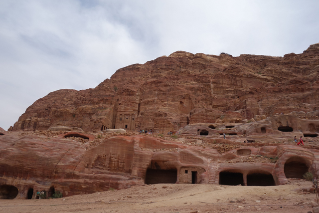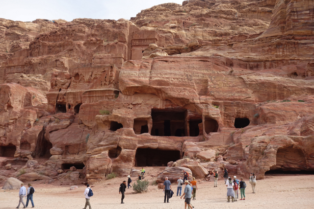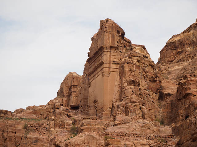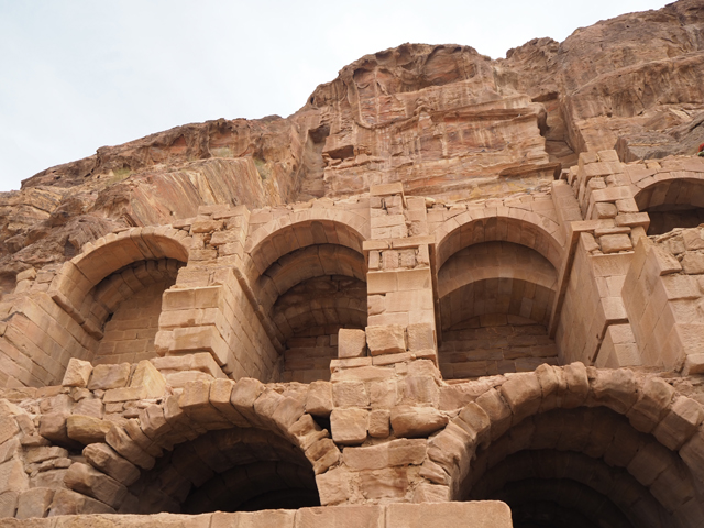 導遊鎖定的目標應該是最右側的「甕冠墓室」(Urn Tomb),畢竟它堆疊相對複雜,雙層連拱形成撐托底座,兩側柱廊開展,宛如延伸了主人生前的統轄威儀。連拱形構的一個個小室遠望頗神秘,隨階經過時卻看不出什麼功能性,不曉得是否也葬著親族,有些應該是從岩壁挖出,有些則像為了外觀勻稱而添砌,過了千年仍沒崩塌足見工匠功力。
