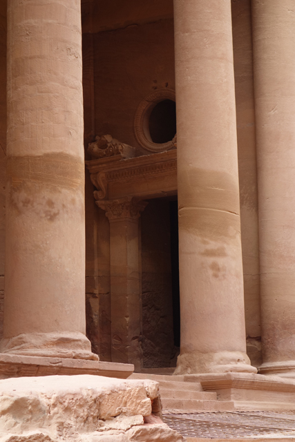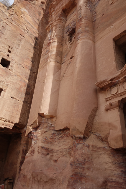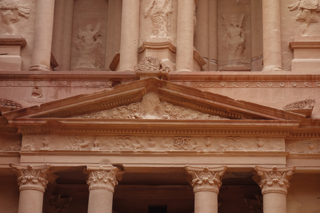 若是一棟砌築恢弘的教堂,對已於歐洲行走過的我,震撼並不會那麼深,然眼前這座是雕於高闊山壁的堂殿立面,那種克服自然後的鬼斧神工,便很令人心折。雙層結構的它像深受希臘羅馬影響,下層是列柱支起的山形楣,柱頭呈「科林斯式」,有很細膩的蕨葉捲翻。簷口的長幅飾帶雖已磨蝕,仍能窺得其間的花瓶與纏藤。上層基本承襲了類似的柱簷,但在央處作了變體,像把一座弧圓涼亭嵌於其間,襯著頂冠的緻密綴邊,顯得華美。