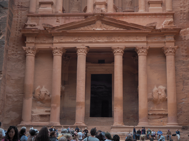 根據資料,下層兩側雕的是希臘雙子神「卡斯托和波路克斯」,上層中央奉著「伊西斯」,兩邊凹陷位是「勝利女神」,其餘皆為亞馬遜女戰士。是怎麼辨認出來的呢?我盯著這些失去頭臉,連身軀特徵都已模糊的雕像陷入思索。不過「納巴泰」人敬的神明也真雜,從抽象石柱轉為希臘人形,而「伊西斯」又是埃及重要的保護女神,為冥王「歐西里斯」之妻,誕下綜合太陽、天空、王權意象的「荷魯斯」。難怪此建築被稱為「Al-Khazneh」,也就是寶藏庫,畢竟請了這麼多神明護守,中央冠頂又有個挺可疑的甕,盜獵者懷疑大獎搞不好就藏在甕裡,於是亂槍擊射,搞得它變得相當殘破。