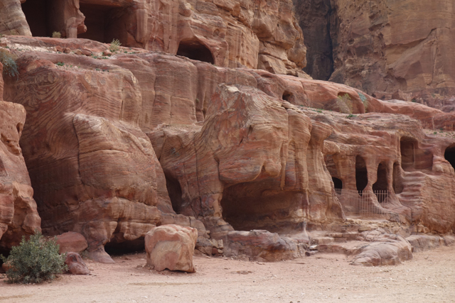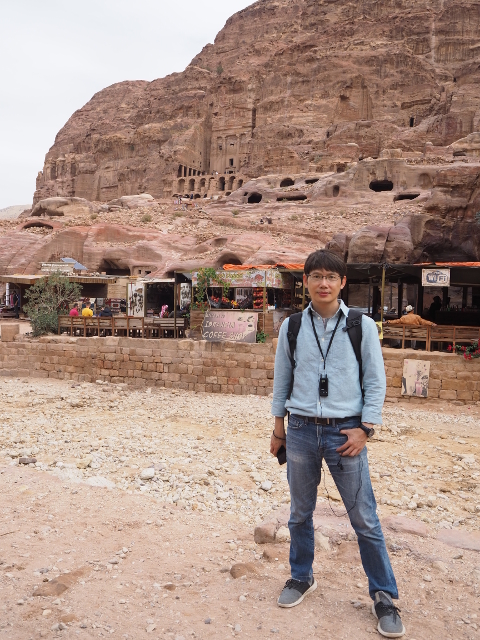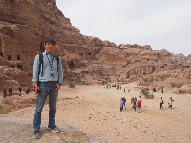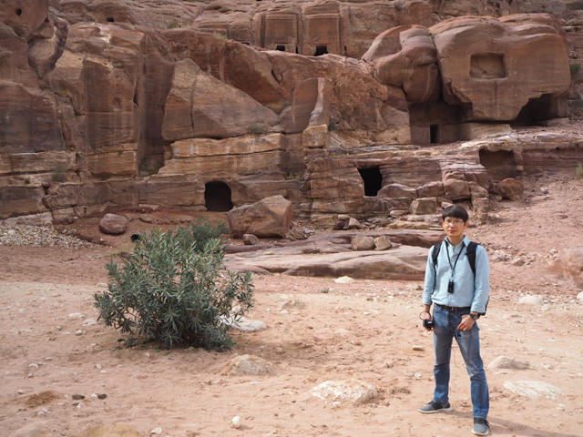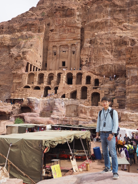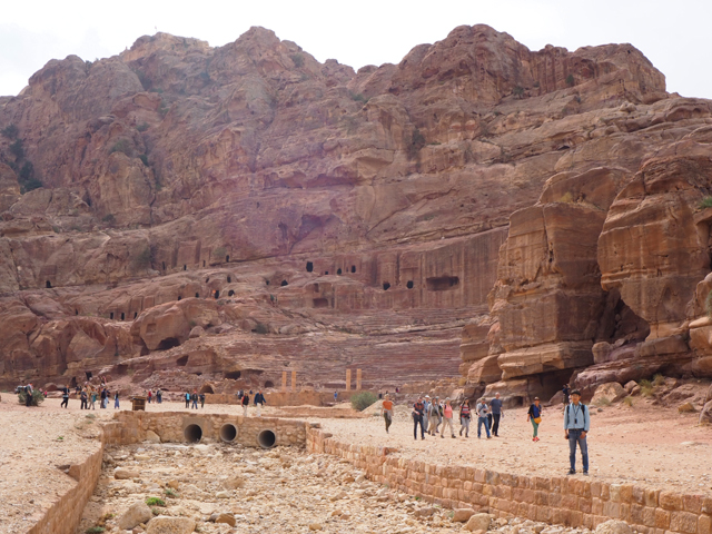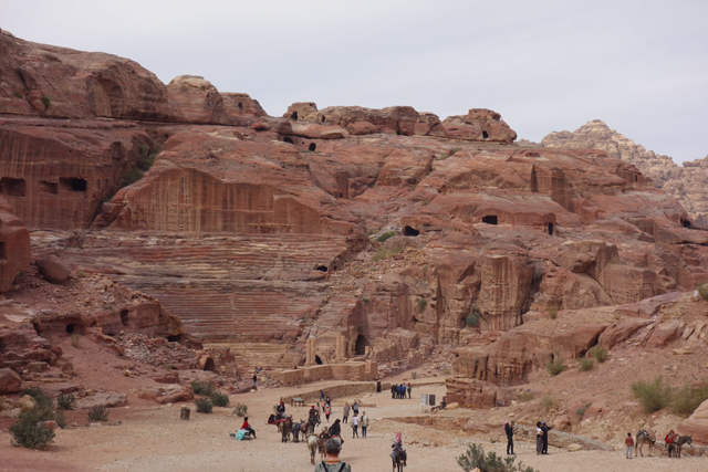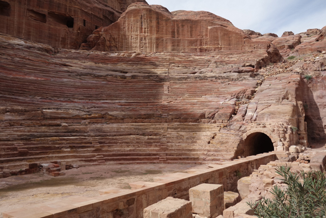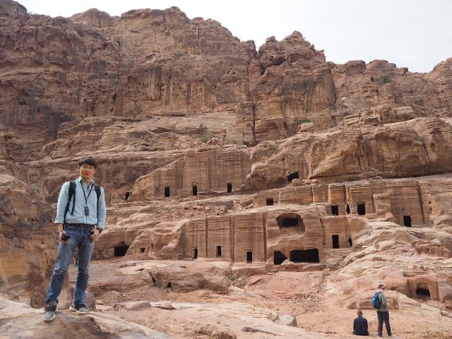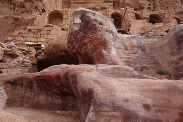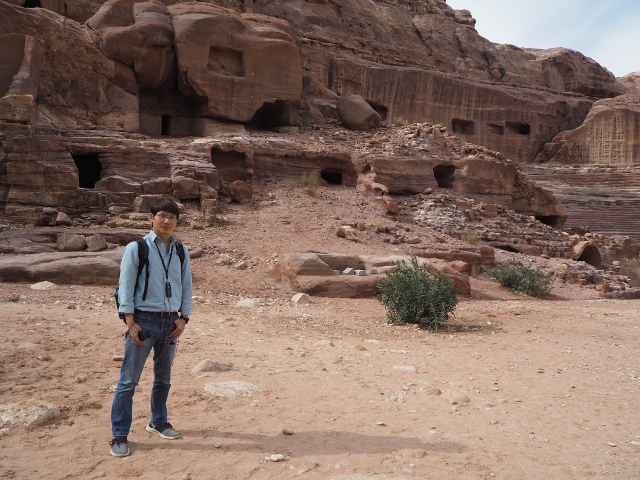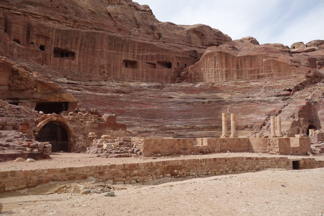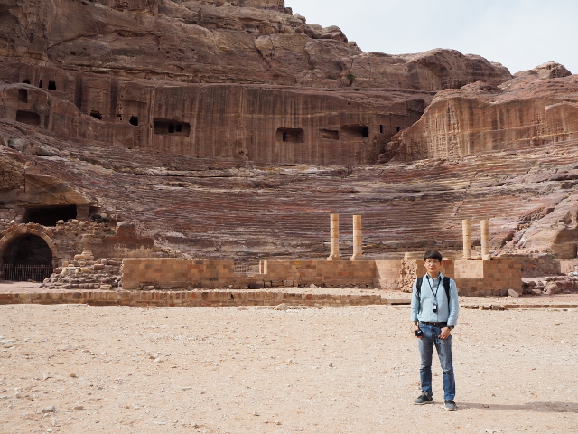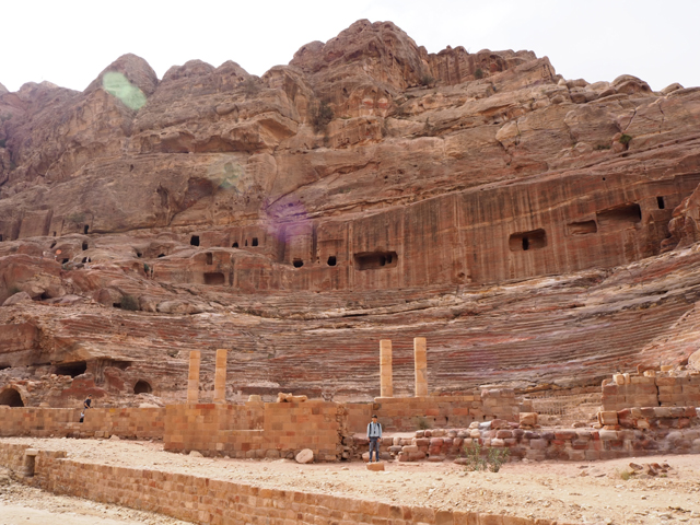 當年真的會同時聚集這麼多人,或參與祭典或觀賞劇目嗎?感覺「Aretas IV」應該身處王朝最興盛的時代,才有本錢同時蓋了華麗墓堂與劇場。我望向最高處,想像那兒的視野及聲場,羅馬接管後為了擴建,將那兒原本的墓室切挖掉,遺留了幾個大窟洞,不曉得晚上坐那的觀眾會不會覺得有陰風往身上吹。