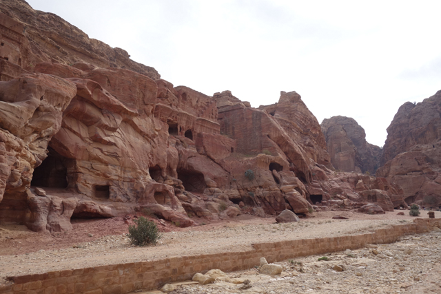 據說另一頭的下山路還有頗多遺跡,經過連結了水道,或許曾能口吐泉線的岩牆獅雕,會進入被精心打造的谷地。它早年因著灌溉系統的佈設,上段成了攀滿綠意的庭園,拱廊中庭旁有從岩壁開鑿的「花園餐室」(Garden Triclinium)。若由峽谷間的步道行落,見到的是結合祭祀的建築群,墓堂立面有三人披巾穿甲,故被稱為「士兵墓室」(Soldier Tomb)。