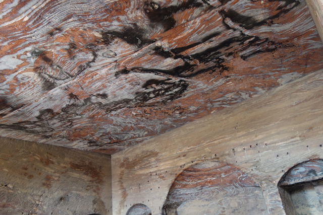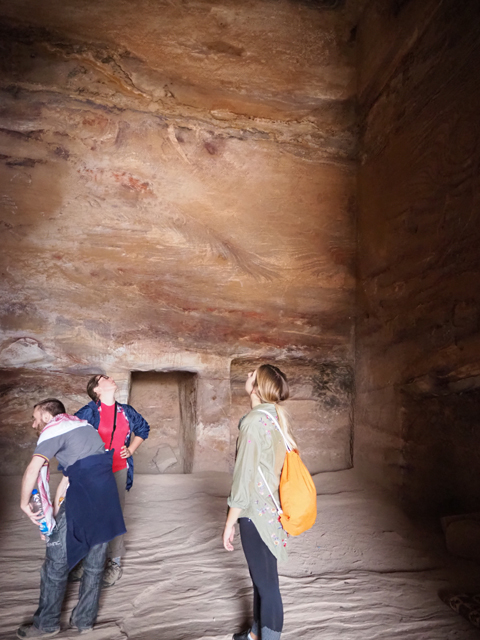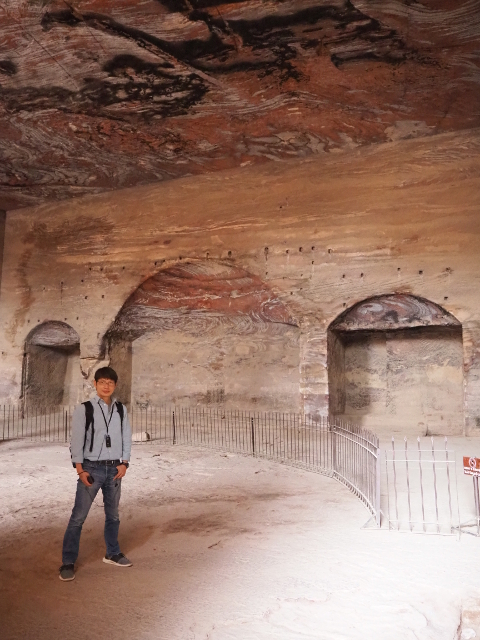 隨導遊走進,在外頭岩間隱現的藍灰斑彩,於墓殿內狂野了起來,彷若流雲也似急湍,還有些莫名的墨黑像書法家酒後的揮灑。我盯望了一陣,才觀察起殿內佈局,導遊說,由於在後來的拜占庭時代,墓殿被基督教徒改造成教堂,背牆的幾個窟坑也成了目前可見的弧頂龕室。那國王的棺塚還藏埋在此嗎?以其富足而該有的輝華陪葬呢?還是早被竊盜一空?